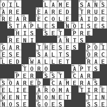 ACROSS 1. Lubricate 4. Unable to walk 8. Without 12. "We ___ not amused" (Victoria) 13. Having ears or earlike features 14. Loyal 15. Bring up, as a child 17. Learning spot: Fr. 18. Assistant 19. Paper fasteners 21. Annoying sounds 23. Part of HMS, perhaps 24. Arrange properly for use 26. Before (prefix) 27. Painter Guido (1575-1642) 28. Pismires 30. Slender fish 31. College papers 34. Luau course 37. Compass dir. 38. Table seasonings 39. The grampus (Milton) 40. Directed 41. Place for singles 42. Actress Charlotte 43. "Corrida" creature 44. Tenement units (abbr.) 46. For each 47. Fast jet (abbr.) 50. Automobile 51. Flew 54. Devices for capturing images 57. Writer Wiesel 58. Odor 60. Become fatigued 62. Gone 63. Music written for nine 64. Metal container 65. Olfactory organ 66. Moves 67. Compass dir. DOWN 1. Rowing implement 2. Angers 3. Tough but pliablecoriaceous 4. Shoestrings 5. Came up 6. Cartoonist voice _ Blanc 7. Paradise 8. Flight of steps 9. Ascend 10. Unadorned 11. Observes 13. Snakelike fish 16. Precipitation 20. Air pressure measure (abbr.) 22. Chooses 25. Clothes sense 27. Raze (variant) 29. Egg locale 30. Set 31. Russian ruler of old 32. Auras 33. Pipe bend 34. Likenesses of persons 35. Mouths or openings 36. Frozen water 41. Had on 43. Cigar-shaped 44. Adept person 45. Component 46. Aches 48. Biscuitlike quick bread 49. Domesticates 51. Stitched 52. Butter sub 53. Mild oath, euphamism for damn 55. Floor covering 56. Indian titles of respect 59. Friend of Pooh 61. Compass dir.