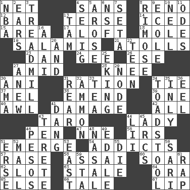ACROSS 1. Fish or hair follower 4. Without 8. Former U.S. Attorney General Janet 12. Tavern 13. Laconic 14. On the rocks 15. Type of rug 17. At or to great height 18. Undercover agent 19. Deli grouping 21. Ringlike coral islands and reefs 23. Daniel's nick name 24. Unit of force equal to gravity 26. Compass dir. 27. Among 28. Leg joint 30. Cuckoo 31. Food allowance for one day 34. Make a knot 37. Cartoonist voice _ Blanc 38. Make improvements or corrections to 39. Single 40. Leather borer 41. Break 42. Everything 43. Edible starchy tuberous root 44. Kenny Rogers chart-topper in '80 46. Writing instrument 47. Compass dir. 50. Big collection agency 51. Develop 54. Inveterate users 57. To erase 58. Slender Brazilian palm 60. Fly high 62. Notch 63. Lacking originality or spontaneity 64. Mouth or opening 65. Otherwise 66. Lie 67. Mouth edge DOWN 1. Basketball assoc. 2. Hearing organs 3. Excercise machine 4. Former Milwaukee Brewers owner Bud 5. Came up 6. Overdraft (abbr.) 7. Stalk of a moss capsule 8. Full of chinks, cracks, or crevices 9. Learning spot: Fr. 10. 1994 drama film starring Jodie Foster 11. Lyric poems 13. Scottish cap 16. Mountain range southwest of Kyrgyzstan 20. Plus 22. Adolescent 25. Supplementing with great effort 27. Afresh 29. Thickened enlargement 30. Housemaid (var.) 31. Hitchcock's "____ Window" 32. ID or VA city 33. Afternoon social gathering 34. Inedible or poisonous agaric 35. In an inward manner 36. Snakelike fish 41. Mild oath, euphamism for damn 43. Cylindrical with tapered ends 44. Cards in a Roman deck? 45. Arches 46. Mexican monetary units 48. Rhinal 49. Peak District village in England 51. Celtic language 52. Shopping center 53. Compass direction 55. Expire 56. Indian skirt 59. R.R. building 61. Strike