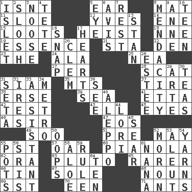 ACROSS 1. Is not 5. Hearing organ 8. Floor covering 11. _ gin 12. Jacques Cousteau's middle name 14. Compass dir. 15. Plunders 17. Robbery 18. Compass dir. 19. Gist 21. R.R. building 22. Lair 23. Definite Article 24. Wing 25. Teachers' org. 27. For each 28. Leave at once 31. Thailand, formerly 35. Mountains (abbr.) 37. Become fatigued 38. Celtic language 39. Ocean 41. Singer James 42. Trial 43. Pipe bend 45. Snake ____ (dice throw) 46. SW Saudi Arabia district 47. Greek goddess of the dawn 49. "Barney Miller" actor Jack 51. Before (prefix) 52. Fifth month 55. Pacific Standard Time (abbr.) 57. Boat paddle 60. Player piano 62. Mouth or opening 63. Cartoon dog 65. More uncommon 66. Metal container 67. Not divided or shared with others 68. Part of speech 69. Fast jet (abbr.) 70. Car or cant ending 71. Pismires DOWN 1. Small island 2. Agitate, as a liquid 3. Trap for birds or small mammals 4. False hair 5. Sight organ 6. Advice 7. Take ten 8. Ananias' fault 9. Queen of England 1702-14 10. Adolescent 13. Comedian Laurel of Laurel & Hardy 16. Fastener 17. Centers 20. To starve (Brit.) 26. First name in cosmetics 29. Johnson of "Laugh-In" 30. Beverages made from leaves 31. Stalk of a moss capsule 32. Angers 33. Aide 34. Paris' subway 36. Observe 40. City in Syria 44. Australian parrot (variant) 48. Shrivel 50. I made a mistake 52. Person of subnormal intelligence 53. Eskimo relative 54. Entertaining tales 55. Plant holders 56. Indian titles of respect 58. Medicinal plant 59. Governing power 61. Nanny 64. "___ Little Indians"