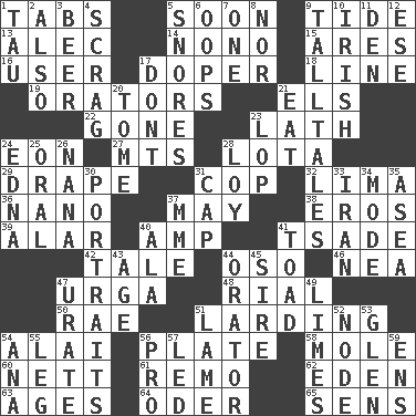 ACROSS 1. Bar bills 5. Within a short period 9. Event that recurs at intervals 13. Actor Baldwin 14. Words to Nanette 15. Ancient Greek god of war 16. One who uses or employs something 17. Drug addict 18. Actor's bit 19. Speakers 21. Raised railways 22. Went 23. Thin strip of wood or metal 24. Age 27. Mountains (abbr.) 28. Globular water bottle used in Asia 29. Window treatment 31. Police officer (slang) 32. Pale green bean 36. Billionth: prefix 37. Fifth month 38. Greek god of love 39. Having or resembling wings 40. Electrical Unit 41. Sadhe (variant) 42. Falsehood 44. Bear (Spanish) 46. Teachers' org. 47. Capital and largest city of Mongolia 48. Monetary unit of Yemen 50. Actress Charlotte 51. Preparing or cooking with lard 54. Jai ____ 56. Food holder 58. Undercover agent 60. Remaining after all deductions 61. San ____ (Riviera town) 62. Paradise 63. Grows older 64. River in Europe 65. Elected reps. DOWN 1. The 19th letter of the Greek alphabet 2. In addition 3. Fermented drink made from hops 4. Lean end of the neck 5. Sounds asleep 6. I made a mistake 7. Single 8. And not 9. Baron Munchausen's specialties 10. From or relating to Ireland 11. Lair 12. Compass dir. 17. Do not 20. Heavy book 21. Ingest 23. Trim (branches) 24. Pulitzer Prize-winning author Ferber 25. Relating to the mouth 26. Grandmother 28. Myrna of the movies 30. Likenesses of persons 31. Head covering 33. SW Asia republic 34. Method 35. At sea 37. Madame (abbr.) 40. According to 41. Frog relative 43. Grow older 44. Speaker 45. Father 47. A salt of uric acid 49. Citrus fruits 51. Unable to walk 52. Thickened enlargement 53. Small, secluded valley 54. Santa ___, CA 55. Part of a journey 56. Adept person 57. Directed 59. Followers of ems
