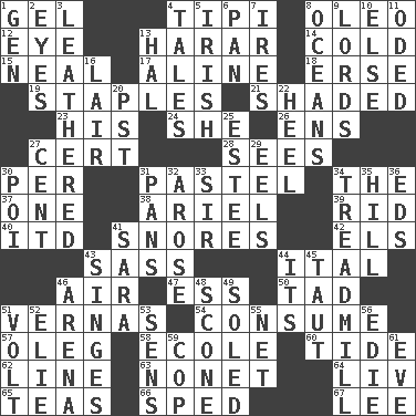 ACROSS 1. Set 4. Native american tent (variation) 8. Margarine 12. Sight organ 13. Ethiopian city, capital of Harari 14. Lacking warmth 15. Anneal 17. Place in a line 18. Celtic language 19. Paper fasteners 21. Cast a shadow over 23. Part of HMS, perhaps 24. A female animal or person 26. Followers of ems 27. Sure thing 28. Perceives with the eye 30. For each 31. Soft color 34. Definite Article 37. Single 38. Satellite of Uranus 39. To free from 40. It would 41. Sounds asleep 42. Raised railways 43. Backtalk 44. Slanted text style (abbr.) 46. Atmosphere 47. Curvy letter 50. Small boy 51. Actresses Bloom and Felton 54. Eat 57. Cassini of fashion 58. Learning spot: Fr. 60. Event that recurs at intervals 62. Actor's bit 63. Music written for nine 64. 54 in ancient Rome 65. Beverages made from leaves 66. Broke a traffic law 67. Area sheltered from the wind DOWN 1. Commissioned mil. rank 2. Snake ____ (dice throw) 3. Tough but pliablecoriaceous 4. Lies 5. From or relating to Ireland 6. Baking dish 7. Angers 8. Seas 9. Titled peers of a realm 10. Otherwise 11. Wrote a lyric poem 13. Actor Linden 16. Den 20. Pacific Standard Time (abbr.) 22. The bottom of a shoe or boot 25. First name in cosmetics 27. Penny 29. Snakelike fish 30. Luau course 31. Zero-star reviews 32. Came up 33. Title for a knight 34. Excercise machine 35. Land elevation 36. Begley and Asner 41. "Two Mules for Sister ____" 43. Burns superficially 44. ___ a Wonderful Life 45. Tense 46. Sports stadium 48. Biscuitlike quick bread 49. Having a sole or soles 51. Electrical Unit 52. Writer Wiesel 53. Elected reps. 55. Fish or hair follower 56. Singer Brickell 59. Police officer (slang) 61. Night before a holiday