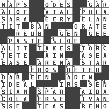 ACROSS 1. Atlas contents 5. Lyric poems 9. Slender fish 12. _ vera 13. Small bottle 14. Monetary unit of Botswana 15. "Two Mules for Sister ____" 16. Suggestive of the supernatural 17. Style 18. Teat (slang) 19. Forbid 21. Declaim 22. Reuben's nickname 24. Commissioned military rank (abbr.) 26. Unit of force equal to gravity 27. Thick mixture 28. _ gin 29. Came down and settled, as after flight 30. Proceeds 32. Torque (variant) 36. Wig 37. The 18th letter of the Arabic alphabet 38. At sea 39. Comfort 40. Sports stadium 42. Play the lead 43. Greek god of love 44. Prevent from occurring 46. Small moist lump or mass 49. Car or cant ending 50. An important port of Yemen 51. Perfect 53. Big collection agency 54. Elected rep. 57. Thailand, formerly 58. Coast Guard woman 61. Opera by Verdi 62. Root beer relative 63. Celtic language 64. "Terrible" tsar 65. Compass dir. 66. Afternoon social gatherings 67. San ____ (Riviera town) DOWN 1. Vertical spar for supporting sails 2. Jai _ 3. Likenesses of persons 4. Ocean 5. Baking chamber 6. Expire 7. Hearing organ 8. Playfully artful 9. POW camp 10. Having winglike extensions 11. The wife of a rajah (variant) 14. For each 19. With the exception that 20. Collude with 21. Single 23. First name in cosmetics 24. American astronaut and politician John 25. Greek goddess of the dawn 27. Entreaty 28. Atmospheres 29. Had dinner 31. Composer Copland 32. Clothes sense 33. Clearly or manifestly demonstrative 34. Posterior 35. Auto 40. "We ___ not amused" (Victoria) 41. The sixth month of the Jewish calendar 43. Snakelike fish 45. Begley and Asner 46. Flat circles 47. Goodbye (Sp.) 48. Calif. Air Force Base 52. Wet nurse (var.) 53. Angers 55. Dutch treat 56. Billionth: prefix 58. Put into a specified state 59. Before (prefix) 60. White ___ sheet 61. Atmosphere