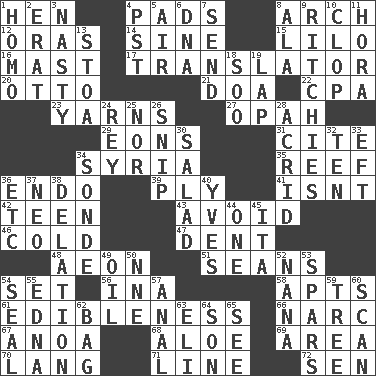 ACROSS 1. Layer 4. Writing tablets 8. Bowlike part 12. Mouths or openings 14. Trig term 15. _ and Stitch 16. Vertical spar for supporting sails 17. Interpreter 20. "Beetle Bailey" pooch 21. ___ good deed 22. Accounting whiz (abbr.) 23. Tall tales 27. Brightly colored fish 29. Immeasurably long periods of time 31. Quote 34. Damascus' land 35. Coral collection 36. Inside; within (prefix) 39. Travel a route regularly 41. Is not 42. Adolescent 43. Keep away from 46. Chilled 47. Gouge 48. Period of immesurable duration 51. Seines 54. Arrange properly for use 56. _ tizzy (2 wds.) 58. Tenement units (abbr.) 61. The property of being fit to eat 66. Drug cop 67. Small Philippine buffalo 68. Medicinal plant 69. Length times width 70. Long (Scottish) 71. Actor's bit 72. Elected rep. DOWN 1. Same (prefix) 2. Part of Q.E.F. 3. Characterized by obscenity 4. Pacific Standard Time (abbr.) 5. Wind 6. Heredity factor (abbr.) 7. Transmit 8. Insect wing 9. Actors Guy, Robert Welles, and Clint 10. Hoof sound 11. Israeli folk dance 13. Portico 18. "Barney Miller" actor Jack 19. Infant locale 24. Marina Del _, California 25. Not either 26. Sever or remove by pinching or nipping 28. Sour-tasting 30. Vegetable dish 32. "___ Little Indians" 33. Bank Draft (abbr.) 34. Something which is sent 36. And so on (abbr.) 37. Modern: prefix 38. Accusation by an informer 40. Jacques Cousteau's middle name 44. Single 45. Call ___ day 49. Petroleum 50. Compass dir. 52. Nanny 53. Practice fights 54. Lick closed 55. Pulitzer Prize-winning author Ferber 57. Of or related to the anus 59. Woody plant 60. Examine hastily 62. Container for groceries 63. Biblical high priest 64. Male child 65. Perceive with the eye