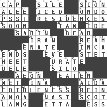 ACROSS 1. Head covering 4. Drop; flow; fall 8. The Jewish people; Israel 12. Toward shelter 14. On the rocks 15. Southwest Nigerian state 16. Inconspicuous attention getter 17. Dwellings 20. Within a short period 21. The 23rd letter of the Hebrew alphabet 22. Binary compound 23. Unit of acoustic absorption 27. Necklace unit 29. SW Asia republic 31. 480, 500 or 516 sheets of paper 34. Related on the mother's side 35. South American Indian 36. Conclusions 39. Night before a holiday 41. Proofreading order 42. Confront 43. A salt of uric acid 46. Ubangi River tributary 47. Grain storage tower 48. A really long time 51. Consumed 54. Dripping 56. _ tizzy (2 wds.) 58. Opera by Verdi 61. The property of being fit to eat 66. It's straight from the horse's mouth 67. Small Philippine buffalo 68. Political cartoonist Thomas 69. Highlander 70. Long (Scottish) 71. Singer James 72. Curvy letter DOWN 1. Balmoral and tarboosh 2. In addition 3. Mexican monetary units 4. Title for a knight 5. Frozen water 6. French article 7. Prepare for publication 8. Male child 9. Event 10. Wrote a lyric poem 11. Olfactory organ 13. Inactive volcano in Sicily 18. Pat or tap gently 19. She-sheep 24. Storage container 25. Retirement account (abbr.) 26. Nathan's nickname 28. Ascend 30. Congenital growth or mark on the skin 32. Adept person 33. Floor protector 34. First name in cosmetics 36. Australian flightless bird 37. Born 38. Conveyance 40. One of the Great Lakes 44. Wing 45. Small child 49. Lubricate 50. Compass dir. 52. Hearing organs 53. Sibling's daughter 54. Welt 55. Pulitzer Prize-winning author Ferber 57. Singer Murray 59. "Vaya con ____" 60. Pismires 62. Paper or plastic container 63. Erode 64. Fast jet (abbr.) 65. R.R. building