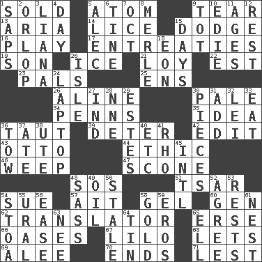 ACROSS 1. Exchanged or delivered for money 5. Smallest unit of an element 9. Lacerate 13. Roberta Peters solo 14. Louse (plural) 15. Evade 16. Shaw product 17. Pleas 19. Male child 20. Frozen water 21. Myrna of the movies 22. Eastern Standard Time (abbr.) 23. Friends 25. Followers of ems 26. Place in a line 30. Light colored 34. Actor Sean's family 35. The main thing one is thinking about 36. Pulled tight 39. Prevent from occurring 42. Prepare for publication 43. Von Bismarck 44. Moral principle 46. Shed a tear 47. Biscuitlike quick bread 48. Mayday 51. Russian ruler of old 54. Take to court 57. Small island 58. Set 60. Commissioned mil. rank 62. Interpreter 65. Celtic language 66. Fertile tracts in a desert 67. _ and Stitch 68. Allows 69. Toward shelter 70. Extremities 71. For fear that DOWN 1. Plant excrements 2. Lowest deck of a ship 3. Climbing, woody, usually tropical vines 4. 24 hours 5. Actor Baldwin 6. Prong on a fork 7. Sep. follower 8. Haggard of country music 9. Small child 10. Singer Brickell 11. Ripens 12. Relief 15. 24-hour periods 18. Age 20. Capri or Wright 24. Portable computer 27. Working for oneself (abbr.) 28. Compass dir. 29. _____ Park, CO 30. Components 31. Say or write further 32. Luau accessory 33. Erode 36. Pull behind 37. Had dinner 38. Shoshoni 40. And so on (abbr.) 41. 17th letter of the Greek alphabet 45. International (abbr.) 48. Backtalk 49. Lubricate 50. Showing deterioration from age 52. Match 53. Musical pauses 54. Portico 55. Mountain range 56. Comfort 58. Gilt 59. Greek god of love 61. Egg locale 63. Born 64. Metal container 65. Pipe bend