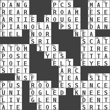 ACROSS 1. Mild oath, euphamism for damn 5. Personal Computers (abbr.) 8. Floor covering 11. Tail end 12. Wander 14. Compass dir. 15. Nick name for Arthur 17. Makeup applied to the cheeks 18. Born 19. Player piano 21. Air pressure measure (abbr.) 22. Daniel's nick name 23. Snakelike fish 24. And not 25. Teachers' org. 27. _ Lanka 28. Jazz singing style 31. Smallest unit of an element 35. It is 37. Hoop that covers a wheel 38. Airs 39. It is so 41. Singer James 42. Lug 43. Biblical high priest 45. Snake ____ (dice throw) 46. Proofreading order 47. Curve 49. Overdraft (abbr.) 51. Beverage made from leaves 52. Be seated 55. Ichor 57. Friend of Pooh 60. Core 62. Corn or form start 63. Stared 65. Leg joints 66. 54 in ancient Rome 67. Small, secluded valley 68. Incision 69. Had dinner 70. Greek goddess of the dawn 71. Indian titles of respect DOWN 1. Window treatment 2. Nest on high 3. Relating to or accompanying birth 4. Broad smile 5. Adept person 6. Overturn; upset 7. Sinks 8. Ananias' fault 9. Toward the sea 10. Adolescent 13. Count _ (2 wds.) 16. Immeasurably long periods of time 17. Noteworthy scarcity 20. Australian parrot (variant) 26. First name in cosmetics 29. Johnson of "Laugh-In" 30. Beverages made from leaves 31. Flats, for short 32. A blast of a horn 33. Clearly or manifestly demonstrative 34. Confronts 36. Observe 40. Scheduled 44. Angers 48. Keg 50. Toadlike animal 52. Scornful expression 53. Ancient Celtic tribe of eastern Britain 54. Trials 55. Monetary unit of Botswana 56. A single undivided whole 58. Stare at amorously 59. Butter sub 61. Extremities 64. Followers of ems