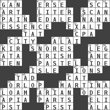 ACROSS 1. Separate the seeds from cotton 4. Celtic language 8. _-fi 11. Nonscientific branch of learning 12. 61 cubic inches 14. Examine minutely or intensely 15. Ache 17. Peak District village in England 18. Grandmother 19. Substance 21. Honor 23. Make lace 24. Tax preparer (abbr.) 25. Municipality 27. Mountain range southwest of Kyrgyzstan 30. Apertif with cassis 31. Sounds asleep 34. Part of a journey 37. _ moment's notice (2 wds.) 38. From or relating to Ireland 39. A saturated hydrocarbon 40. Nine, plus one 41. Soft color 43. Binary compound 44. Small island 45. Charged atoms 47. Small boy 49. Domesticated feline 50. Lowest deck of a ship 52. Chrissie's court nemesis 56. Rich soil 57. Believer in; advocate of (suffix) 60. Baltic tributary 61. Capital of Western Samoa 62. Pieces 63. Biblical high priest 64. Pacific Standard Time (abbr.) 65. Inconspicuous attention getter 66. Chicken ___ king DOWN 1. Open wide 2. Ancient river in northeast Turkey 3. Nuclear Threat Initiatives 4. Voters do this 5. Travel on an animal 6. R.R. building 7. Snakelike fish 8. Any of the three canals of the cochlea 9. Patter 10. _ tizzy (2 wds.) 13. To riddle 14. Fastener 16. Remaining after all deductions 20. Negative votes 22. One more than ninety 25. Quote 26. SW Asia republic 27. Originate 28. For fear that 29. American tennis player Robert 30. Krazy ___ of comics 32. Pinches, bites 33. Spoken 34. (Had) reclined 35. Extremities 36. Unit of force equal to gravity 42. One who doesn't tell the truth 44. Wedding promise 46. Von Bismarck 47. Distinguishing feature 48. _ mater 49. 2nd pers. sing. pres. of can (arch.) 50. I made a mistake 51. Infant food 52. Floor coverings 53. The main thing one is thinking about 54. 1994 drama film starring Jodie Foster 55. Roberta Peters solo 56. Infant locale 58. Reproach for some lapse or misdeed 59. Big collection agency