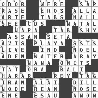 ACROSS 1. Aroma 5. We are 9. Plant excrement 12. To erase 13. Greek god of love 14. Silent film actress Nazimova 15. Johnson of "Laugh-In" 16. Bar bills 17. Shopping center 18. Observe 19. Music discs 21. Brizilian seaport 22. California wine valley 24. Bar bill 26. Like a shrinking violet 27. Indian state 28. Bristle 29. Advice 30. Beach, in Buenos Aires 32. Fast planes 36. Not recorded 37. Working for oneself (abbr.) 38. Christmas carol 39. Arabian gulf 40. Wetness 42. Like ___ of sunshine 43. Grandmother 44. Leaves out 46. Make lace 49. Mouth or opening 50. Indonesian resort city 51. Ethiopian city, capital of Harari 53. Marina Del _, California 54. Label 57. SW Asia republic 58. Mountain range southwest of Kyrgyzstan 61. Deli pickle 62. Connecting point 63. 480, 500 or 516 sheets of paper 64. Characteristic smell of wine 65. Compass dir. 66. He sold his birthright 67. At once, immediately (arch.) DOWN 1. Mouths or openings 2. Have the gumption 3. Clearly or manifestly demonstrative 4. To separate or throw off 5. Soaks 6. Epoch 7. Director Reiner 8. Curvy letter 9. Narrow boards 10. Assad's deity 11. Friendly 14. Wet nurse (var.) 19. Tax preparer (abbr.) 20. Moist 21. Basketball assoc. 23. NE Netherlands city 24. Miss Universe 1986, Barbara Palacios _ 25. "One Day ___ Time" 27. Enthusiastic 28. Before Barbara or Clara 29. Wing 31. Woody, climbing, usually tropical plant 32. Slow-paced one 33. Conclusion 34. Afternoon social gatherings 35. Roguish 40. Armed conflict 41. Loose flowing garment 43. And not 45. Fifth month 46. One or ones belonging to thee 47. Composer Copland 48. Barter 52. A saturated hydrocarbon 53. Tall New Zealand timber tree 55. In addition 56. Small, secluded valley 58. "We ___ not amused" (Victoria) 59. French article 60. American Automobile Association (abbr.) 61. Heredity factor (abbr.)