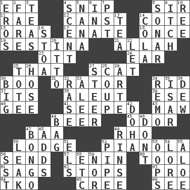 ACROSS 1. Bank Draft (abbr.) 4. Sever or remove by pinching or nipping 8. Title for a knight 11. Actress Charlotte 12. 2nd pers. sing. pres. of can (arch.) 14. ____ d'Azur (French Riviera) 15. Mouths or openings 17. Related on the mother's side 18. At one time in the past 19. French poetic form 21. Assad's deity 23. Baseball player Mel 24. Ewer handle 25. Not this but _ 27. Scram! 30. Surprise greeting 31. Speaker 34. To free from 37. ___ a Wonderful Life 38. Eskimo relative 39. Compass dir. 40. Unit of force equal to gravity 41. Oozed 43. Opening into something insatiable 44. Fermented drink made from hops 45. Aroma 47. Sound made by sheep 49. 17th letter of the Greek alphabet 50. Inn 52. Player piano 56. Transmit 57. Soviet premier 1918-24 60. Utensil 61. Droops 62. Obstructs or blocks passage 63. Adept person 64. Ring climax 65. Algonquian 66. Perceive with the eye DOWN 1. Greek god of love 2. Conductor's collection 3. Beverages made from leaves 4. Odor 5. Grandmother 6. _ tizzy (2 wds.) 7. Pacific Standard Time (abbr.) 8. Underwater navigation system 9. Hankering 10. Portuguese money of account (variant) 13. Afternoon social gathering 14. Root beer relative 16. Portico 20. "Tell ____ the Marines!" 22. Allow 25. Carryall 26. Flexible conduit 27. Navigate 28. Clever action or accomplishment 29. Johnson of "Laugh-In" 30. Of large size 32. To erase 33. Toward shelter 34. San ____ (Riviera town) 35. Austrian river, tributary to the Danube 36. Morning condensation 42. Capital of the state of Qatar 44. Container for groceries 46. Do not 47. Beat drum 48. Sums up 49. Wash lightly 50. Path through which fluid escapes 51. Raised railways 52. Corncob 53. I made a mistake 54. Old wives' tales, e.g. 55. _ vera 56. Fast jet (abbr.) 58. And so on (abbr.) 59. And not