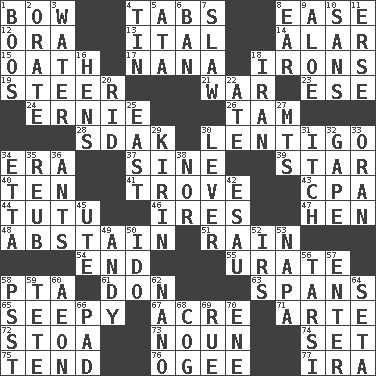 ACROSS 1. Ribbon knot 4. Bar bills 8. Relaxation 12. Mouth or opening 13. Slanted text style (abbr.) 14. Having or resembling wings 15. Pledge 17. Nanny 18. Removes the wrinkles 19. Guide 21. Armed conflict 23. Compass dir. 24. Bert's buddy 26. Scottish cap 28. Neighbor of Neb. 30. Small, flat, pigmented spot on the skin 34. Period 37. Trig term 39. Play the lead 40. "___ Little Indians" 41. Collection of objects 43. Tax preparer (abbr.) 44. Ballerina skirt 46. Angers 47. Layer 48. Refrain by choice 51. Water falling in drops from the sky 54. Conclude 55. A salt of uric acid 58. Parent Teacher Association (abbr.) 61. Spanish title 63. Connects, as a bridge 65. Not well drained, as in land 67. 1/640 square mile 71. Johnson of "Laugh-In" 72. Portico 73. Part of speech 74. Put into a specified state 75. Watch over 76. Double curve, resembling the letter S 77. Retirement account (abbr.) DOWN 1. Expressions of contempt or scorn 2. Declaim 3. Wetness 4. Shallow baking pan 5. "One Day ___ Time" 6. Prohibit 7. Cole _ (cabbage dish) 8. Hearing organ 9. Medicinal plant 10. Without 11. Celtic language 16. Coop moms 18. SW Asia republic 20. To free from 22. Had dinner 25. Compass direction 27. Mountains (abbr.) 29. Japanese brewing company 30. Crowbar 31. Hankering 32. Open wide 33. NW Algerian seaport 34. Singer James 35. Reuben's nickname 36. Pismires 38. Or not 42. He sold his birthright 45. Shoshoni 49. Actor Griffith 50. Wedding promise 52. Big collection agency 53. California wine valley 56. Tarsus (plural) 57. Keyboard key 58. Inconspicuous attention getter 59. Wig 60. Period of immesurable duration 62. Billionth: prefix 64. Stalk of a moss capsule 66. Groovy apt. 68. Gear tooth 69. Sorrow 70. Compass dir.