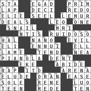 ACROSS 1. R.R. building 4. Mild oath 8. Demure 12. Infant locale 13. Tenth: prefix 14. Do over again 15. Writer Wiesel 17. Stitch closed the eyes of (a falcon) 18. Arboreal primate 19. Allots cards 21. Lion 23. Single 24. Slow-paced one 26. Medical imaging device (abbr.) 28. Nuclear Threat Initiatives 30. Boisterous (Brazilian Portuguese) 34. Actor Linden 37. Billionth: prefix 39. Tending to cause great harm 40. Biblical high priest 41. World-weariness 43. Pipe bend 44. Unable to walk 46. Look after 47. Teachers' org. 48. Player piano 51. Scratch 54. Make supply last 55. Stay 58. Reproach for some lapse or misdeed 61. It would 63. Sports stadium 65. Evade 67. NW Algerian seaport 71. Comfort 72. Not divided or shared with others 73. French philosopher Descartes 74. Nilotic language 75. Adolescent 76. Ancient Persian 77. Nine, plus one DOWN 1. Downhill vehicle 2. Stories 3. Bee-related 4. Begley and Asner 5. Unit of force equal to gravity 6. Adept person 7. Deli pickle 8. Before (prefix) 9. San ____ (Riviera town) 10. Goddess of spring and wife of Bragi 11. Greater amount 16. Flair 18. Australian parrot (variant) 20. Be seated 22. Australian flightless bird 25. Actor's bit 27. Binary compound 29. Before Barbara or Clara 30. One shot 31. Baking chamber 32. Drop; flow; fall 33. Rounded earthenware pot or jar 34. Assist 35. Jai ____ 36. Pale green bean 38. Compass dir. 42. The content of cognition 45. Compass dir. 49. Migrant worker of the '30s 50. Allow 52. Basketball assoc. 53. Hoop that covers a wheel 56. Started a card game 57. Take place subsequently 58. State of inaction 59. _ vera 60. Whine 62. Dormintory (informal) 64. Age 66. Lair 68. Portuguese money of account (variant) 69. Plus 70. Born
