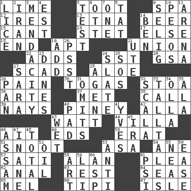 ACROSS 1. Welles in "The Third Man" 5. A blast of a horn 9. Health resort 12. Angers 13. Inactive volcano in Sicily 14. Fermented drink made from hops 15. Patter 16. Proofreading order 17. Otherwise 18. Conclusion 19. Fitting 21. The state of being joined or united 22. Does sums 24. Fast jet (abbr.) 26. Girls' org. (abbr.) 27. Oodles 28. Medicinal plant 29. Ache 30. Ancient Roman robes 32. Portico 36. Johnson of "Laugh-In" 37. Was introduced to 38. Give a ring to 39. Negative votes 40. Abounding in pines 42. Silent film actress Nazimova 43. Electrical Unit 44. Country estate 46. Small island 49. Begley and Asner 50. Part of Q.E.F. 51. Snob 53. White ___ sheet 54. One (Scot) 57. Suttee (variant) 58. ____ Jay Lerner 61. Entreaty 62. Of or related to the anus 63. Remainder 64. Oceans 65. Cartoonist voice _ Blanc 66. Native american tent (variation) 67. Small island DOWN 1. Louse (plural) 2. SW Asia republic 3. Ananias' fault 4. Eastern Standard Time (abbr.) 5. Trial 6. Baseball player Mel 7. Single 8. Make lace 9. Major League Baseball Commissioner Bud 10. Mexican monetary units 11. Sports stadium 14. Benjamin's nick name 19. Increase 20. Inconspicuous attention getter 21. Shoshoni 23. Natives or inhabitants of Denmark 24. Schedule 25. Distress signal 27. "Two Mules for Sister ____" 28. Rep 29. Baking dish 31. Leaves out 32. Any of the three canals of the cochlea 33. Baron Munchausen's specialties 34. Water jar 35. According to 40. Writing tablet 41. Jacques Cousteau's middle name 43. Soggy 45. Retirement account (abbr.) 46. Indian state 47. Lacking in sense or substance 48. "_____ Recall" 52. Lubricate 53. Against 55. Be tempered by heat 56. Relaxation 58. Tate display 59. Flowery wreath 60. Viper 61. Air pressure measure (abbr.)