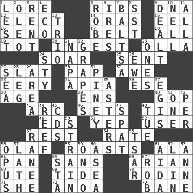 ACROSS 1. Old wives' tales, e.g. 5. Chest bones 9. Heredity factor (abbr.) 12. Choose 14. Mouths or openings 15. Snakelike fish 16. Sir (Sp.) 17. Waist strap 18. 100% 19. Small child 20. Eat 23. Rounded earthenware pot or jar 24. Fly high 25. Emitted 27. Narrow board 30. Infant food 32. Deep reverence 33. Suggestive of the supernatural 34. Capital of Western Samoa 36. Compass dir. 38. Ripen 39. Followers of ems 40. Republican Party 43. Curve 46. Arranges properly for use 48. Prong on a fork 49. Begley and Asner 51. Slangy assent 52. One who makes use of a thing 53. Remainder 54. Assign a rank or rating to 56. Norwegian king 58. Exposes to great heat 61. Insect wing 64. Baking dish 65. Without 66. Believer in; advocate of (suffix) 68. Shoshoni 69. Event that recurs at intervals 70. "The Thinker" sculptor 71. A female animal or person 72. Small Philippine buffalo 73. Object of repulsion DOWN 1. For fear that 2. Margarine 3. Monthly bill 4. Environmental prefix 5. Loose flowing garment 6. Angers 7. Greek mezzo-soprano Agnes 8. Fast jet (abbr.) 9. Started a card game 10. 1994 drama film starring Jodie Foster 11. Silent film actress Nazimova 13. Musical group of three 21. California wine valley 22. Wine fruits 23. Washington bills 24. Filthy place 26. She-sheep 27. Ocean 28. Part of a journey 29. Type of rug 31. Abounding in pines 35. Michaelmas daisies 37. Armor plate that protects the chest 41. Single 42. For each 44. Coral collection 45. Music discs 47. Petty quarrel 48. Third day of the wk. 50. Put through a sieve 53. The wife of a rajah (variant) 55. Russian ruler of old 56. Musical composition 57. Thin strip of wood or metal 59. Southwest Nigerian state 60. Toward the sea 61. Opera by Verdi 62. (Had) reclined 63. Singer Murray 65. R.R. building 67. Director Reiner