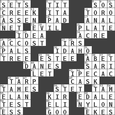 ACROSS 1. Puts into a specified state 5. Teat (slang) 8. Mayday 11. Small stream 13. Call ___ day 14. "Corrida" creature 15. NE Netherlands city 16. Groovy apt. 17. Of or related to the anus 18. Fish or hair follower 19. Tending to cause great harm 21. Food holder 22. The content of cognition 24. Measure of real estate 25. Buttonhole 27. Big collection agency 29. Friends 30. Potato state 32. Relationship diagram 33. First name in cosmetics 35. Collude with 39. Natives or inhabitants of Denmark 41. Indian skirt 42. Allow 43. Medicinal drug used to evoke vomiting 45. Canvas cover 48. Keg 49. Domesticates 50. Proofreading order 52. Scottish cap 55. Flair 56. Apertif with cassis 57. Peak District village in England 59. Trial 60. Biblical high priest 61. Thermoplastic polyamide 62. Curvy letter 63. Thick or sticky substance 64. Makes supply last DOWN 1. Glance over 2. Celtic language 3. One of the two male reproductive glands 4. Perceive with the eye 5. Native american tent (variation) 6. Slanted text style (abbr.) 7. Small amount or degree 8. Echolocation 9. Declaim 10. Not divided or shared with others 12. Leg joints 14. Baby powder 20. Large container 21. Romantic infatuation 23. Administered medicine 25. Fitting 26. 4-wheeled motor vehicle 27. Binary compound 28. Actress Charlotte 30. It is 31. Fertile tracts in a desert 33. Compass dir. 34. Put into a specified state 36. Sass 37. Period 38. Nervous spasm 40. High mountains 43. Frozen water 44. Eucharist need 45. Lies 46. Collect or gather 47. Monthly bill 49. Wig 50. Grain storage tower 51. Musical group of three 53. _ vera 54. Not women's 56. Barrel 58. Color