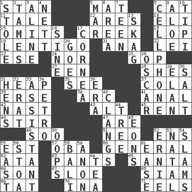 ACROSS 1. Comedian Laurel of Laurel & Hardy 5. Floor protector 8. Domesticated feline 11. Story 12. Ancient Greek god of war 14. Connecticut Ivy Leaguer 15. Leaves out 17. Small stream 18. Trim (branches) 19. Small, flat, pigmented spot on the skin 21. Santa ___, CA 22. Luau accessory 23. Compass dir. 24. Or not 25. Grand Old Party 27. Car or cant ending 28. "______ My Girl" (Turtles hit) 31. Pile 35. Observe 37. Root beer relative 38. Celtic language 39. Curve 41. Of or related to the anus 42. Political cartoonist Thomas 43. The first octave above the treble staff 45. Monthly bill 46. Use a swizzle stick 47. "We ___ not amused" (Victoria) 49. "Barney Miller" actor Jack 51. Modern: prefix 52. Followers of ems 55. Eastern Standard Time (abbr.) 57. Chief or king in Benin or Nigeria 60. Commissioned military rank 62. "One Day ___ Time" 63. Leg coverings 65. Before Barbara or Clara 66. Male child 67. _ gin 68. Thailand, formerly 69. Make lace 70. _ tizzy (2 wds.) 71. Snakelike fish DOWN 1. Fur scarf 2. Corrects by punishment or discipline 3. Place in a line 4. Remaining after all deductions 5. Third mo. 6. Type of rug 7. Adolescent 8. Portable communications device 9. _ vera 10. Native american tent (variation) 13. Heroin 16. Trig term 17. Pupil covering 20. Moves 26. Witty Wilde 29. Style 30. Table seasoning 31. Coop moms 32. Part of Q.E.F. 33. Aide 34. Stone: prefix 36. Period 40. Rigngs loudly 44. Family _ (genealogy) 48. Immeasurably long periods of time 50. I made a mistake 52. Bert's buddy 53. Brizilian seaport 54. Hits or strikes with great force 55. Compass direction 56. Portico 58. Indonesian resort city 59. At once, immediately (arch.) 61. Comfort 64. Beverage made from leaves