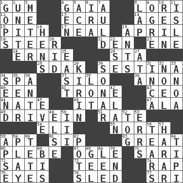 ACROSS 1. Chewing product 4. Greek goddess of the earth (variant) 8. Australian parrot (variant) 12. Single 13. Shade of tan 14. Grows older 15. Heart or essence 17. Actress Patricia 18. Showery time 19. Navigate 21. Lair 23. Compass dir. 24. Bert's buddy 26. R.R. building 28. Neighbor of Neb. 30. French poetic form 34. Health resort 37. Grain storage tower 39. Soon (poet.) 40. Car or cant ending 41. Heavy duty weighing machine 43. Corporate head (abbr.) 44. Nathan's nickname 46. Slanted text style (abbr.) 47. In the manner of 48. Popular '50s hangout 51. Pace 54. Biblical high priest 55. 0 degrees 58. Fitting 61. Small drink 63. Relatively large 65. Cadet 67. Stare at amorously 71. Indian skirt 72. Suttee (variant) 73. Adolescent 74. Hit sharply and swiftly 75. Sight organs 76. Downhill vehicle 77. _ Lanka DOWN 1. Republicans 2. Join together 3. Distance measurement 4. Commissioned military rank (abbr.) 5. Adept person 6. Lyricist Gershwin 7. Old (Scot.) 8. Pet locale 9. Legendary monster 10. It's straight from the horse's mouth 11. Small island 16. Coop moms 18. Pismires 20. To free from 22. Compass dir. 25. Compass direction 27. "One Day ___ Time" 29. Japanese brewing company 30. Echolocation 31. South American Indian 32. Christmas carol 33. Small Philippine buffalo 34. Post 35. Lightbulb-shaped fruit 36. Opposed to 38. Car dealer's back yard 42. Enthusiasm 45. First lady 49. Otherwise 50. One more than two 52. Coat; cloak 53. Blunders 56. Rends 57. Ethiopian city, capital of Harari 58. Domed church section 59. Frolic 60. False hair 62. Plant holders 64. Native american tent (variation) 66. Twice 68. Set 69. Area sheltered from the wind 70. Conclude