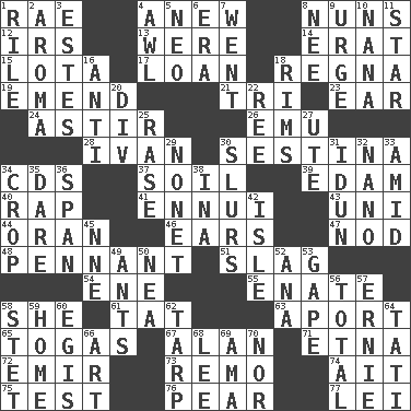 ACROSS 1. Actress Charlotte 4. Afresh 8. Religious women 12. Big collection agency 13. Past tense of be (plural) 14. Part of Q.E.F. 15. Globular water bottle used in Asia 17. Grant temporary use of 18. Canadian anthropologist Darnell 19. Make improvements or corrections to 21. Three (prefix) 23. Hearing organ 24. Moving or stirring 26. Australian flightless bird 28. _ the terrible 30. French poetic form 34. Music discs 37. Land 39. Dutch treat 40. Reproach for some lapse or misdeed 41. World-weariness 43. University (slang) 44. NW Algerian seaport 46. Hearing organs 47. Allow head to fall sleepily 48. Pre-World Series prize 51. Volcanic refuse 54. Compass dir. 55. Maternal 58. A female animal or person 61. Make lace 63. To the left, to Queeg 65. Ancient Roman robes 67. ____ Jay Lerner 71. Inactive volcano in Sicily 72. Independent ruler or chieftain 73. San ____ (Riviera town) 74. Small island 75. Trial 76. Lightbulb-shaped fruit 77. Flowery wreath DOWN 1. Cause heat under the collar 2. Odor 3. _____ Park, CO 4. Leather borer 5. Modern: prefix 6. Epoch 7. Left 8. Born 9. Goad 10. Grandmother 11. Play the lead 16. Against 18. Basketball hoops 20. HTML Container Element 22. To separate or throw off 25. To erase 27. Shoshoni 29. Music written for nine 30. Runs notes together 31. Goddess of spring and wife of Bragi 32. Billionth: prefix 33. Among 34. Riding implement 35. Have the gumption 36. Connect, as a bridge 38. _ tizzy (2 wds.) 42. Small island 45. Compass dir. 49. Pismires 50. Teachers' org. 52. Santa ___, CA 53. Open wide 56. "_____ Recall" 57. Bert's buddy 58. Proofreading order 59. Residence 60. The front part of a cuirass 62. Canvas cover 64. Jacques of French films 66. Nonscientific branch of learning 68. Area sheltered from the wind 69. Wet nurse (var.) 70. And not