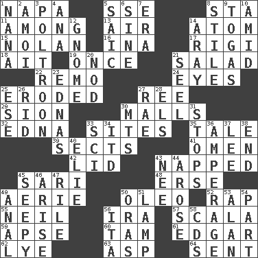 ACROSS 1. California wine valley 5. Compass dir. 8. R.R. building 11. Amid 13. Atmosphere 14. Tiny particle 15. Pitcher Ryan 16. _ tizzy (2 wds.) 17. Swiss mountan, "Queen of the Mountains" 18. Small island 19. At one time in the past 21. First course 22. San ____ (Riviera town) 24. Sight organs 25. Eaten away 27. To separate or throw off 29. The Jewish people; Israel 30. Promenades 32. Pulitzer Prize-winning author Ferber 33. Locates 35. Falsehood 39. Religious groups 41. Presage 42. Flaplike covering 43. Slept 45. Indian skirt 48. Celtic language 49. Nest on high 50. Butter sub 52. Hit sharply and swiftly 55. Famous astronaut Armstrong 56. Lyricist Gershwin 57. Any of the three canals of the cochlea 59. Domed church section 60. Scottish cap 61. _ Allan Poe 62. Potassium hydroxide 63. Viper 64. Posted DOWN 1. Grandmother 2. Mine, in Marseilles 3. Coward 4. Santa ___, CA 5. Ketch in the Levant 6. Trig term 7. Epoch 8. Vertical member of a panel or frame 9. Ancient Roman robes 10. Among 12. Dwarf 14. Like ___ of sunshine 20. Lower and raise head in agreement 21. Sew up the eyelids of hawks and falcons 23. Ferber et al. 25. Compass dir. 26. To free from 27. Actress Charlotte 28. Raised railways 30. Mountains (abbr.) 31. Constricts 33. _-fi 34. It would 36. Electrical Measurement 37. Area sheltered from the wind 38. Conclude 40. Writer Wiesel 43. Born 44. Came up 45. Oozy 46. Ascend 47. Cause heat under the collar 49. Of or related to the anus 50. Mouths or openings 51. Desk light 53. Actor Alda or Thicke 54. Role in a play 56. Call ___ day 58. Music discs