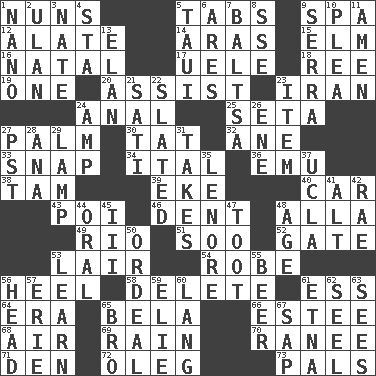 ACROSS 1. Religious women 5. Bar bills 9. Health resort 12. Having winglike extensions 14. Caspian sea tributary 15. Shade tree 16. Relating to or accompanying birth 17. Ubangi River tributary 18. To sift 19. Single 20. Aid 23. SW Asia republic 24. Of or related to the anus 25. Stalk of a moss capsule 27. Inside of hand 30. Make lace 32. A saturated hydrocarbon 33. Fastener 34. Slanted text style (abbr.) 36. Australian flightless bird 38. Scottish cap 39. Make supply last 40. 4-wheeled motor vehicle 43. Luau course 46. Gouge 48. Silent film actress Nazimova 49. _ de Janeiro 51. "Barney Miller" actor Jack 52. Yard entry 53. Den 54. Loose flowing garment 56. The bottom of a shoe or boot 58. Erase 61. Curvy letter 64. Period 65. Actor Lugosi 66. First name in cosmetics 68. Wind 69. Water falling in drops from the sky 70. The wife of a rajah (variant) 71. Lair 72. Cassini of fashion 73. Friends DOWN 1. Billionth: prefix 2. ____ Bator 3. Nathan's nickname 4. R.R. building 5. "Change" in Tahitian 6. Ancient Greek god of war 7. Greek mezzo-soprano Agnes 8. Compass dir. 9. Spanish missionary in California 10. Entreaty 11. So be it 13. Liveliness 21. Suttee (variant) 22. Scheduled 23. Detail 24. Electrical Unit 26. Compass dir. 27. Pacific Standard Time (abbr.) 28. Santa ___, CA 29. Desk light 31. Receives possession of 35. Poe poem 37. Southern CA. univ. 41. Keyboard modifier key 42. Actress Charlotte 44. Of the mouth 45. One more than two 47. A blast of a horn 48. Mature 50. Severe or trying experience 53. Acquire or gain knowledge or skills 55. Fermented drink made from hops 56. Froth on beer 57. 4th largest of the Great Lakes 59. Writer Wiesel 60. Austrian-born American filmmaker Fritz 61. Inactive volcano in Sicily 62. Stitch closed the eyes of (a falcon) 63. Observes 65. Sis' sibling 67. Plant excrement