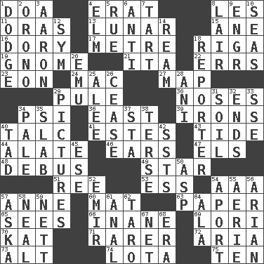 ACROSS 1. ___ good deed 4. Part of Q.E.F. 8. French article 11. Mouths or openings 13. Type of eclipse 15. One (Scot) 16. Dinghy 17. Distance measurement (Brit.) 18. Port city in Latvia 19. Dwarf 21. Call ___ day 22. Blunders 23. Period of immesurable duration 24. Apple computer (short form) 27. Atlas unit 29. Whimper 30. Olfactory organs 34. Air pressure measure (abbr.) 36. 90 degrees 39. Removes the wrinkles 40. Baby powder 41. _____ Park, CO 43. Event that recurs at intervals 44. Having winglike extensions 46. Hearing organs 47. Raised railways 48. Alight from a bus 49. Play the lead 51. To separate or throw off 53. Double-curved letter 54. American Automobile Association (abbr.) 57. Queen of England 1702-14 60. Floor covering 63. Some stationery 65. Observes 66. Lacking in sense or substance 69. Australian parrot (variant) 70. Krazy ___ of comics 71. More uncommon 72. Operatic vocal solo 73. Keyboard modifier key 74. Globular water bottle used in Asia 75. "___ Little Indians" DOWN 1. Evade 2. U. of Maine site 3. Composer Copland 4. Shade tree 5. Sorrow 6. Opposed to 7. Small pie 8. Den 9. Engineer (abbr.) 10. Oceans 12. Symbol (abbr.) 14. 480, 500 or 516 sheets of paper 18. News announcer 20. Australian flightless bird 25. Toward shelter 26. Stop 28. Cuckoo 29. Photos 31. The visible part of the earth's surface 32. Conclusions 33. Compass dir. 34. Diluted with white 35. Thick slice 37. R.R. building 38. Laconic 40. Bit 42. Fast planes 45. Compass dir. 50. Viper 52. Independent ruler or chieftain 54. To the left, to Queeg 55. Nest on high 56. Believer in; advocate of (suffix) 57. "____ silly question..." 58. Anneal 59. Remaining after all deductions 61. Of or related to the anus 62. Edible starchy tuberous root 64. Wing 67. Fish or hair follower 68. Epoch