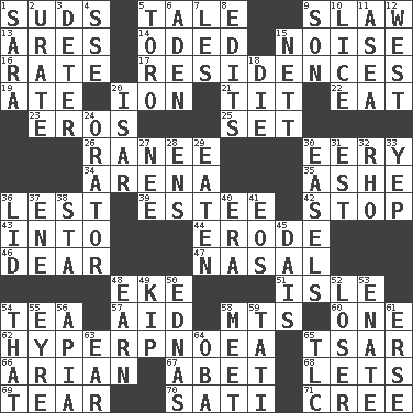 ACROSS 1. Soap bubbles 5. Story 9. Cole _ (cabbage dish) 13. Ancient Greek god of war 14. Wrote a lyric poem 15. Annoying sound 16. Pace 17. Homes 19. Had dinner 20. Electrically charged atom 21. Teat (slang) 22. Erode 23. Greek god of love 25. Arrange properly for use 26. Indian princess (variant) 30. Suggestive of the supernatural 34. Sports stadium 35. American tennis player Robert 36. For fear that 39. First name in cosmetics 42. Discontinue 43. To the inside or interior of 44. Wear away 46. Letter starter 47. Relating to the nose 48. Supplement with great effort 51. Capri or Wright 54. Beverage made from leaves 57. Assist 58. Mountains (abbr.) 60. Single 62. Abnormally rapid or deep breathing 65. Russian ruler of old 66. Believer in; advocate of (suffix) 67. Collude with 68. Allows 69. Pull into pieces 70. Suttee (variant) 71. Algonquian DOWN 1. "Two Mules for Sister ____" 2. A salt of uric acid 3. Prevent from occurring 4. Compass dir. 5. "Corrida" creature 6. An important port of Yemen 7. French article 8. Prepares for publication 9. Boy, to dad 10. Louse (plural) 11. Toward the sea 12. 270 degrees 15. Remaining after all deductions 18. Pass on 20. Austrian river, tributary to the Danube 24. Speaker 27. Born 28. Followers of ems 29. Ingested 30. Artist's stands 31. Eastern Standard Time (abbr.) 32. 17th letter of the Greek alphabet 33. Slangy assent 36. Flaplike covering 37. Compass dir. 38. R.R. building 40. Period 41. Greek goddess of the dawn 45. Raised platform 48. Merit 49. Monetary unit of Laos 50. Ferber et al. 52. Failure 53. Maternal 54. Not this but _ 55. Jane of fiction 56. Capital of Western Samoa 58. Rendezvous 59. Jacques of French films 61. Celtic language 63. Hearing organ 64. Chief or king in Benin or Nigeria 65. Affectionate concern, for short