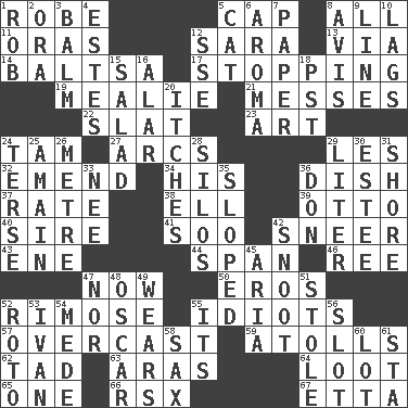 ACROSS 1. Loose flowing garment 5. Head covering 8. Everything 11. Mouths or openings 12. "Two Mules for Sister ____" 13. By way of 14. Greek mezzo-soprano Agnes 17. Constricting 19. Ear of corn 21. Makes clutter 22. Narrow board 23. Tate display 24. Scottish cap 27. Arches 29. French article 32. Make improvements or corrections to 34. Part of HMS, perhaps 36. Food container 37. Assign a rank or rating to 38. Pipe bend 39. Von Bismarck 40. Father 41. "Barney Miller" actor Jack 42. Scornful expression 43. Compass dir. 44. Connect, as a bridge 46. To riddle 47. At this time 50. Greek god of love 52. Full of chinks, cracks, or crevices 55. Foolish or stupid persons 57. Cloudy 59. Ringlike coral islands and reefs 62. Small amount or degree 63. Ancient river in northeast Turkey 64. Spoils 65. Single 66. Acura sports coupe 67. Singer James DOWN 1. Director Reiner 2. Mouth or opening 3. Lip ointment 4. _____ Park, CO 5. Domesticated feline 6. Odor 7. Some stationery 8. Advice 9. Actor's bit 10. Straggles 12. Compass dir. 15. First course 16. Having or resembling wings 18. Pacific Standard Time (abbr.) 20. Irritating cutaneous sensations 24. Laconic 25. With great haste 26. Distance measurement (Brit.) 28. Grain storage towers 29. 61 cubic inches 30. First name in cosmetics 31. Dinah or Pauly 33. Born 35. Slanted 36. Spanish title 42. Snob 45. Roberta Peters solo 47. And not 48. Motion picture award 49. Puts on (as clothing) 51. Took without asking 52. Printing process, for short 53. "Terrible" tsar 54. Ancient Persian 55. ___ a Wonderful Life 56. Narrow opening 58. Saxophone 60. Car dealer's back yard 61. R.R. building