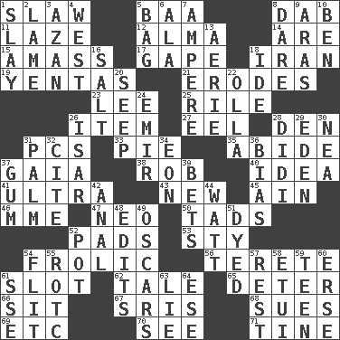 ACROSS 1. Cole _ (cabbage dish) 5. Sound made by sheep 8. Small moist lump or mass 11. Goldbrick 12. _ mater 14. "We ___ not amused" (Victoria) 15. Collect or gather 17. Stare wonderingly 18. SW Asia republic 19. Gossips 21. Eats (away) 23. Area sheltered from the wind 25. Cause heat under the collar 26. Detail 27. Snakelike fish 28. Lair 31. Personal Computers (abbr.) 33. Sliced dessert 35. Tolerate 37. Greek goddess of the earth (variant) 38. Director Reiner 40. The content of cognition 41. Extremist 43. ___ Haven, CT 45. The 18th letter of the Arabic alphabet 46. Madame (abbr.) 47. Modern: prefix 50. Bits 52. Groovy apts. 53. Filthy place 54. Play 56. Cylindrical with tapered ends 61. Position in a hierarchy or organization 62. Falsehood 65. Prevent from occurring 66. Be seated 67. Indian titles of respect 68. Institutes legal proceedings 69. And so on (abbr.) 70. Perceive with the eye 71. Prong on a fork DOWN 1. Kill 2. Unable to walk 3. Muslim summons to prayer 4. Compass direction 5. Paper or plastic container 6. Chicken ___ king 7. Electrical Unit 8. Have the gumption 9. Ancient river in northeast Turkey 10. Benjamin's nick name 13. Nest on high 16. Table seasoning 18. Binary compound 20. Ooze 22. Rounded earthenware pot or jar 24. Independent ruler or chieftain 26. Austrian river, tributary to the Danube 28. "You Light Up My Life" star Conn 29. Genesis locale 30. Teachers' org. 31. Inside of hand 32. Quote 34. Period of immesurable duration 36. Prejudice 37. Chewing product 39. Wagers 42. Of or related to the anus 44. Electrical Unit 48. Proofreads 49. Motion picture awards 51. Colored 52. Plant holder 54. Secret move to avoid paying debts 55. College mil. group 57. Relief 58. Needle holder 59. Adolescent 60. Celtic language 61. Compass dir. 63. Falsehood 64. Compass dir.