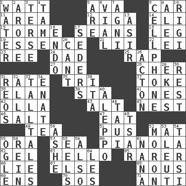 ACROSS 1. Electrical Unit 5. Actress Gardner 8. Auto 11. Type of rug 12. Capital of Latvia 14. Connecticut Ivy Leaguer 15. Singer Mel 17. Actors Connery and Penn 18. Part of a journey 19. Gist 21. Cards in a Roman deck? 22. Luau accessory 23. To separate or throw off 24. June honoree 25. Hit sharply and swiftly 27. Single 28. "Mermaids" star 31. Pace 35. Three (prefix) 37. Casino tip 38. Style 39. R.R. building 41. Singles 42. Spanish pot 43. Keyboard modifier key 45. Egg locale 46. Table seasoning 47. Consume 49. Afternoon social gathering 51. Tenth month of the Hindu calendar 52. Floor covering 55. Mouth or opening 57. Ocean 60. Player piano 62. Set 63. Phone greeting 65. More uncommon 66. Whopper 67. Otherwise 68. Common sense 69. Followers of ems 70. Mayday 71. Against DOWN 1. Wetness 2. Came up 3. Laconic 4. Docile 5. "We ___ not amused" (Victoria) 6. Small bottle 7. Hindu god of fire 8. Portable communications device 9. Toward shelter 10. Swiss mountan, "Queen of the Mountains" 13. SW Saudi Arabia district 16. Inside; within (prefix) 17. Spring feasts 20. Patter 26. NE Massachussets city 29. Makes supply last 30. Respite 31. Vintage cars 32. Silent film actress Nazimova 33. Baron Munchausen's specialties 34. Maternal 36. Call ___ day 40. City in Syria 44. "Change" in Tahitian 48. Russian ruler of old 50. American tennis player Robert 52. Person of subnormal intelligence 53. Native American of Southwest Alaska 54. Tarsus (plural) 55. Stare at amorously 56. It's straight from the horse's mouth 58. Snakelike fish 59. In addition 61. Grandmother 64. French article