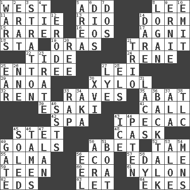 ACROSS 1. Compass direction 5. Increase 8. Area sheltered from the wind 11. Nick name for Arthur 13. _ de Janeiro 14. Dormintory (informal) 15. More valued for its uncommonness 16. Greek goddess of the dawn 17. Hindu god of fire 18. R.R. building 19. Mouths or openings 21. Distinguishing feature 22. Periodic rise and fall of the sea level 24. French philosopher Descartes 25. Main course 27. Flowery wreath 29. Small Philippine buffalo 30. Xylene (variant) 32. Monthly bill 33. All-night dance parties 35. Blind as ____ 39. 1973 Nobel Price Winner (Physics) Leo 41. Give a ring to 42. Health resort 43. Medicinal drug used to evoke vomiting 45. Proofreading order 48. Keg 49. Purposes of endeavors 50. Collude with 52. Scottish cap 55. _ mater 56. Environmental prefix 57. Peak District village in England 59. Adolescent 60. Epoch 61. Thermoplastic polyamide 62. Begley and Asner 63. Allow 64. Makes supply last DOWN 1. Armed conflicts 2. Part of Q.E.F. 3. Ski resort town in Vermont 4. Make a knot 5. Type of rug 6. "Vaya con ____" 7. Two (Sp.) 8. Utah city north of Ogden 9. Bert's buddy 10. Send forth 12. Wear away 14. Have the gumption 20. To separate or throw off 21. Musical group of three 23. Feeling or showing extreme anger 25. Hearing organ 26. Compass dir. 27. Sodium hydroxide 28. Raised railways 30. 16 31. Shoestrings 33. Strike 34. Alias (abbr.) 36. Sass 37. In the manner of 38. Affectionate concern, for short 40. Fast planes 43. Frozen water 44. Eucharist need 45. Having a sole or soles 46. Softens 47. Liveliness 49. Yard entry 50. Measure of real estate 51. Water vessel 53. Medicinal plant 54. Not women's 56. Snakelike fish 58. Color