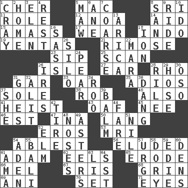 ACROSS 1. "Mermaids" star 5. Big _ 8. _ Lanka 11. Hero or heavy, e.g. 12. Small Philippine buffalo 14. Help 15. Collect or gather 17. Erode 18. _ china 19. Gossips 21. Full of chinks, cracks, or crevices 23. Small drink 25. Examine minutely or intensely 26. Capri or Wright 27. Ewer handle 28. 17th letter of the Greek alphabet 31. Slender fish 33. Rowing implement 35. Goodbye (Sp.) 37. Flatfish 38. Director Reiner 40. In addition 41. Robbery 43. Clumsy lout 45. Born 46. Eastern Standard Time (abbr.) 47. _ tizzy (2 wds.) 50. Long (Scottish) 52. Greek god of love 53. Medical imaging device (abbr.) 54. Most capable 56. Evaded 61. First man 62. Snakelike fish 65. Wear away 66. Cartoonist voice _ Blanc 67. Indian titles of respect 68. Smile widely 69. Black tropical American cuckoo 70. Arrange properly for use 71. Sight organs DOWN 1. Supercomputer manufacturer 2. Dwelling 3. Flair 4. State of inaction 5. Informal term for the mouth 6. A saturated hydrocarbon 7. Rough 8. Without 9. Travel on or in a vehicle 10. Wedding promise 13. N. Chile seaport 16. Backtalk 18. Electrically charged atom 20. Grain storage tower 22. Hindu Mythology: god of death 24. Lightbulb-shaped fruit 26. Angers 28. Cause heat under the collar 29. Flexible conduit 30. Bear (Spanish) 31. Moves 32. Set down 34. Friend of Pooh 36. Mild oath, euphamism for damn 37. A female animal or person 39. Lip ointment 42. Become fatigued 44. Conductor's collection 48. Olfactory organs 49. Michaelmas daisies 51. The longest river in the world 52. Shade tree 54. Arabian gulf 55. Indonesian resort city 57. Goad 58. Dinghy 59. Singer Brickell 60. Cub Scout units 61. Wet nurse (var.) 63. Falsehood 64. Fast jet (abbr.)