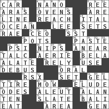 ACROSS 1. Automobile 4. Billionth: prefix 8. Portuguese money of account (variant) 11. Ancient river in northeast Turkey 13. Baking chambers 15. "We ___ not amused" (Victoria) 16. Actor's bit 17. Arrive at 18. Slanted text style (abbr.) 19. Sea 21. Area sheltered from the wind 22. Puts into a specified state 23. Actress Charlotte 24. Corporate head (abbr.) 27. Fast jet (abbr.) 29. Cooking vessels 30. Thick mixture 34. 23rd letter of the Greek alphabet 36. Pinches, bites 39. Approach 40. Baby powder 41. Nest on high 43. Actor Lugosi 44. Having winglike extensions 46. Depend 47. Purpose 48. To get out of a bus 49. Taken by mouth 51. Acura sports coupe 53. Arrange properly for use 54. Set 57. Become fatigued 60. Cut the grass 63. Evade 65. Lyric poems 66. Eskimo relative 69. Actor Alda or Thicke 70. "___ Little Indians" 71. Chalkboard 72. Indonesian resort city 73. Erode 74. Type of rug 75. Commissioned mil. rank DOWN 1. Bodily heat indicating an inflammation 2. N. Chile seaport 3. Indian princess (variant) 4. Not either 5. "___ Maria" 6. Anneal 7. Single time 8. Assign a rank or rating to 9. Part of Q.E.F. 10. Snakelike fish 12. Ocean 14. "______ My Girl" (Turtles hit) 18. Byzantium, centuries later 20. Non-commissioned officer (abbr.) 25. Inactive volcano in Sicily 26. Flexible twig of a willow tree 28. Health resort 29. Photos 31. Perceives with the eye 32. Story 33. Epoch 34. Light colored 35. Thick slice 37. Before (prefix) 38. Grain storage towers 40. Small amount or degree 42. Jane of fiction 45. Curvy letter 50. Had dinner 52. Dec. holiday 54. Russian prison camp 55. Peak District village in England 56. Soviet premier 1918-24 57. Carry 58. It may be bright or harebrained 59. Monthly bill 61. Rounded earthenware pot or jar 62. Erode 64. Experiment locale 67. Shoshoni 68. Beverage made from leaves
