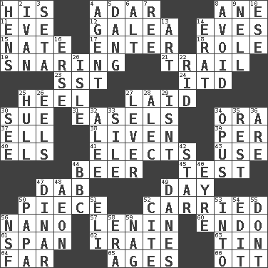 ACROSS 1. Part of HMS, perhaps 4. The sixth month of the Jewish calendar 8. One (Scot) 11. First lady 12. An organ shaped like a helmet 14. Nights before holidays 15. Nathan's nickname 17. Keyboard key 18. Hero or heavy, e.g. 19. Catching in a trap 21. Lag or linger behind 23. Fast jet (abbr.) 24. It would 25. The bottom of a shoe or boot 27. Put down 30. Take to court 31. Artist's stands 34. Mouth or opening 37. Pipe bend 38. Make or become more lively 39. For each 40. Raised railways 41. Chooses 43. Purpose 44. Fermented drink made from hops 45. Trial 47. Pat or tap gently 49. 24 hours 50. Part 52. Borne 56. Billionth: prefix 57. Soviet premier 1918-24 60. Inside; within (prefix) 61. Connect, as a bridge 62. Feeling or showing extreme anger 63. Metal container 64. Distant 65. Ripens 66. Baseball player Mel DOWN 1. Coop moms 2. "Terrible" tsar 3. Stalk of a moss capsule 4. Representative 5. Mild oath, euphamism for damn 6. The first octave above the treble staff 7. To sift 8. Keep away from 9. 1994 drama film starring Jodie Foster 10. Compass dir. 13. Nonscientific branch of learning 14. Part of Q.E.F. 16. Celtic language 20. Small island 22. To free from 25. Frame or body of a ship 26. Snakelike fish 27. Prying instrument 28. Actor Baldwin 29. Is not 30. Observe 32. Toward shelter 33. Drop; flow; fall 34. Musical composition 35. Remainder 36. "We ___ not amused" (Victoria) 42. Play the lead 44. English channel? 46. Jane of fiction 47. Middle Eastern gold or silver currency 48. A really long time 49. Natives or inhabitants of Denmark 50. Dad 51. Biblical high priest 52. Quote 53. To the inside or interior of 54. Prepare for publication 55. Do not 56. Science/research agcy. 58. Period 59. Tired old horse