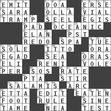 ACROSS 1. Send forth 5. ___ good deed 8. Celtic language 12. "Two Mules for Sister ____" 13. Water jar 15. Small bottle 16. _____ steamer (cargo ship) 18. Sew up the eyelids of hawks and falcons 19. Armor plate that protects the chest 20. Writing tablet 22. Pertaining to the sea 24. Style 26. Pacific Standard Time (abbr.) 27. Redecorate 28. Health resort 29. Third day of the wk. 32. Flatfish 35. "Tell ____ the Marines!" 37. Mouth or opening 38. Mild oath 39. Ocean 40. Mouths or openings 41. Connecticut Ivy Leaguer 42. Painter Guido (1575-1642) 43. Grand slam 44. For each 45. Mayday 46. Assign a rank or rating to 49. Parent Teacher Association (abbr.) 50. Tumult 51. Deli grouping 55. Curve 56. Singer James 57. Prepare for publication 59. Consumed 63. One third of a yard 64. General guideline 65. Trig term 66. Not wild 67. Teachers' org. 68. Trial DOWN 1. Eastern Standard Time (abbr.) 2. Third mo. 3. Retirement account (abbr.) 4. ________ with (broke a safety seal) 5. Two (Sp.) 6. Margarine 7. Actor Baldwin 8. Incident 9. Swiss mountan, "Queen of the Mountains" 10. Ketch in the Levant 11. Raised railways 14. City in Syria 17. Diluted with white 21. June honoree 23. White ___ sheet 25. Annoying sounds 28. Flight of steps 29. "Corrida" creature 30. Mountain range 31. Relaxation 32. Ooze 33. Stare 34. Den 36. Nine, plus one 40. Cloudy 42. Wanderer 45. R.R. building 47. "One Day ___ Time" 48. Hoop that covers a wheel 49. Food holder 51. Portico 52. Smallest unit of an element 53. Goddess of spring and wife of Bragi 54. Drop; flow; fall 56. Newt 58. Beverage made from leaves 60. Make a knot 61. Followers of ems 62. Fish or hair follower