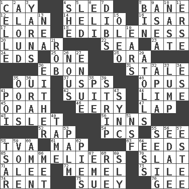 ACROSS 1. Island 4. Downhill vehicle 8. Object of repulsion 12. Style 14. Sun: prefix 16. Austrian river, tributary to the Danube 17. Old wives' tales, e.g. 18. The property of being fit to eat 20. Type of eclipse 22. Ocean 23. Had dinner 24. Begley and Asner 25. Single 28. Mouth or opening 30. Inky black, to poets 31. Lacking originality or spontaneity 35. Fr. "Yes" 37. United States Postal Service (abbr.) 40. Musical composition 41. Sweet dark-red dessert wine 42. Sets or collections 44. Welles in "The Third Man" 45. Brightly colored fish 46. Suggestive of the supernatural 47. Infant locale 48. Small island 50. Restaurants 52. Strike 54. Personal Computers (abbr.) 55. Perceive with the eye 58. Federal power corp. 61. Atlas unit 63. Gives food to 65. Wine waiters 70. Narrow board 71. Toward shelter 72. Klaipeda city 73. Drop; flow; fall 74. Monthly bill 75. Chop _ 76. Unit of force equal to gravity DOWN 1. Cell (Danish) 2. Verbally 3. Tall tales 4. A female animal or person 5. Directed 6. Connecticut Ivy Leaguer 7. Rights 8. Storage container 9. Toward the sea 10. Political cartoonist Thomas 11. Celtic language 13. Teachers' org. 15. Butter sub 19. Hearing organs 21. Director Reiner 26. Good sense 27. Follow as a consequence or result 29. Ringlike coral islands and reefs 30. One or the other 32. Capital of Western Samoa 33. Mass 34. Compass dir. 35. I made a mistake 36. Mountain range 38. Sliced dessert 39. Remove all contents or possession from 41. Luau course 43. Synchronize (abbr.) 49. Not wild 51. Science/research agcy. 53. Inside of hand 55. Major League Baseball Commissioner Bud 56. Peak District village in England 57. First name in cosmetics 58. Russian ruler of old 59. Short-tailed, large-bodied rat 60. So be it 62. Sliced desserts 64. Double-curved letter 66. Was introduced to 67. Australian flightless bird 68. To separate or throw off 69. Mischievous