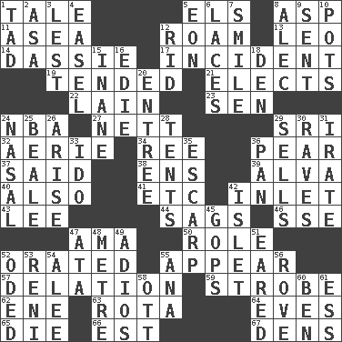 ACROSS 1. Falsehood 5. Raised railways 8. Cleo's killer 11. At sea 12. Wander 13. Lion 14. Small ungulate mammals of Africa 17. Event 19. Watched over 21. Opts 22. (Had) reclined 23. Elected rep. 24. Basketball assoc. 27. Remaining after all deductions 29. _ Lanka 32. Nest on high 34. To sift 36. Lightbulb-shaped fruit 37. Alleged 38. Followers of ems 39. Inventor's middle name 40. In addition 41. And so on (abbr.) 42. An arm off of a larger body of water 43. Area sheltered from the wind 44. Sinks 46. Compass dir. 47. Nanny (var.) 50. Hero or heavy, e.g. 52. Declaimed 55. Become visible 57. Conveyance 59. Disco prop 62. Compass dir. 63. Roll call or roster of names 64. Nights before holidays 65. Expire 66. Eastern Standard Time (abbr.) 67. Hiding places for outlaws DOWN 1. Small boy 2. White ___ sheet 3. For fear that 4. Artist's stand 5. A really long time 6. Shoestrings 7. Grin 8. Actor Baldwin 9. Emitted 10. Cooking vessels 12. To free from 15. Silly 16. Singer Brickell 18. Lair 20. Main course 24. Relating to the nose 25. Calif. Air Force Base 26. Originate 28. Portable shelters 29. Makes a sale 30. All-night dance parties 31. Feeling or showing extreme anger 33. Wedding promise 35. Fortification 36. Baking dish 42. Small island 45. Republicans 47. "One Day ___ Time" 48. Distance measurement (Brit.) 49. Goodbye (Sp.) 51. Having ears or earlike features 52. Wrote a lyric poem 53. Painter Guido (1575-1642) 54. Toward shelter 55. Santa ___, CA 56. Be footloose 58. Baseball player Mel 60. Benjamin's nick name 61. Curvy letter