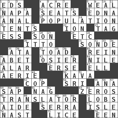 ACROSS 1. Begley and Asner 4. 1/640 square mile 8. Welt 12. California wine valley 14. Theater features 16. Pulitzer Prize-winning author Ferber 17. Of or related to the anus 18. Census information 20. Portable shelters 22. Electrically charged atom 23. Label 24. Double-curved letter 25. Boy, to dad 28. And so on (abbr.) 30. "Tell ____ the Marines!" 31. Message 35. _ moment's notice (2 wds.) 37. Frog relative 40. It's straight from the horse's mouth 41. Collude with 42. Flexible twig of a willow tree 44. Mediterranean tributary 45. Having or resembling wings 46. Celtic language 47. Pipe bend 48. Nest on high 50. Polynesian shrub of the pepper family 52. Police officer (slang) 54. Indian title of respect (Mr.) 55. Santa ___, CA 58. Plant excrement 61. Tired old horse 63. Nothings 65. Interpreter 70. Tennis shots 71. Helper 72. Spanish missionary in California 73. Capri or Wright 74. Political cartoonist Thomas 75. Louse (plural) 76. Car or cant ending DOWN 1. Maternal 2. Natives or inhabitants of Denmark 3. Connects, as a bridge 4. Cleo's killer 5. Corporate head (abbr.) 6. Strike 7. Needle case 8. Soggy 9. Prepare for publication 10. Small Philippine buffalo 11. Long (Scottish) 13. Keyboard modifier key 15. A type of plum 19. Pismires 21. Fast jet (abbr.) 26. "Beetle Bailey" pooch 27. Trap for birds or small mammals 29. Pupil covering 30. Of or pertaining to medicine 32. Famous astronaut Armstrong 33. Deli pickle 34. Compass dir. 35. Competent 36. Rend 38. Atmosphere 39. Writing tables 41. Auto club (abbr.) 43. Located in or toward the back 49. Immeasurably long periods of time 51. Namely 53. Friends 55. Came up 56. Having high moral qualities 57. NE Netherlands city 58. Comedian Laurel of Laurel & Hardy 59. Roberta Peters solo 60. Writing tablets 62. Highlander 64. Biblical high priest 66. Fish or hair follower 67. Three (prefix) 68. The grampus (Milton) 69. Actress Charlotte