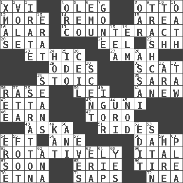 ACROSS 1. 16 4. Cassini of fashion 8. Von Bismarck 12. Greater amount 14. San ____ (Riviera town) 15. Type of rug 16. Having or resembling wings 17. Frustrate 20. Stalk of a moss capsule 21. Snakelike fish 22. Quiet! 23. Principle of right and wrong 27. Housemaid 29. Lyric poems 31. Scram, to a cat 34. Unemotional 35. "Two Mules for Sister ____" 36. Raze (variant) 39. Luau accessory 41. Afresh 42. Singer James 43. Group of southern Bantu languages 46. Merit 47. "Corrida" creature 48. "____ silly question..." 51. Amusement-park features 54. Bank Draft (abbr.) 56. A saturated hydrocarbon 58. Moist 61. Rotating or pertaining to rotation 66. Slanted text style (abbr.) 67. Within a short period 68. One of the Great Lakes 69. Become fatigued 70. Inactive volcano in Sicily 71. Plant excrements 72. Teachers' org. DOWN 1. Dec. holiday 2. Grand slam 3. Feeling or showing extreme anger 4. The grampus (Milton) 5. Lion 6. Australian flightless bird 7. Went 8. Boat paddle 9. File 13 10. Technician 11. Pledge 13. Part of Q.E.F. 18. Afternoon social gathering 19. Shade tree 24. Being at a high temperature 25. Wedding promise 26. To provide with a ceiling 28. Slender Brazilian palm 30. Aroma 32. "We ___ not amused" (Victoria) 33. The 23rd letter of the Hebrew alphabet 34. Seines 36. To riddle 37. "One Day ___ Time" 38. Ski resort town in Vermont 40. Composer Stravinsky 44. RI univ. 45. Lower and raise head in agreement 49. Krazy ___ of comics 50. Cuckoo 52. Prepare for publication 53. Smooth fabric 54. Celtic language 55. One third of a yard 57. Nights before holidays 59. Female horse 60. Entreaty 62. Santa ___, CA 63. Epoch 64. Mouth edge 65. Consenting reply
