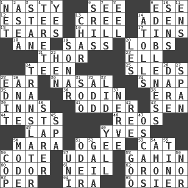 ACROSS 1. Smutty 6. Observe 9. Compass dir. 12. First name in cosmetics 13. Algonquian 14. An important port of Yemen 15. Pulls apart 16. Land elevation 17. Canisters 18. A saturated hydrocarbon 19. Backtalk 20. Tennis shots 21. Son of Odin 23. Pipe bend 24. Adolescent 25. Bobsleighs 28. Ewer handle 30. Relating to the nose 34. Fastener 35. Heredity factor (abbr.) 36. "The Thinker" sculptor 38. Epoch 39. Restaurants 41. More peculiar 43. Elected rep. 44. Trials 46. Vintage cars 48. Infant locale 49. Jacques Cousteau's middle name 50. Hindu Mythology: god of death 51. Double curve, resembling the letter S 53. Domesticated feline 56. ____ d'Azur (French Riviera) 57. Freehold land 58. Homeless child 60. Aroma 61. Famous astronaut Armstrong 62. U. of Maine site 63. For each 64. Lyricist Gershwin 65. Flexible twig of a willow tree DOWN 1. Fish or hair follower 2. At sea 3. Comedian Laurel of Laurel & Hardy 4. Cylindrical with tapered ends 5. It is so 6. Indian titles of respect 7. Snakelike fish 8. Snakelike fish 9. The property of being fit to eat 10. Elected reps. 11. Followers of ems 13. Burn to charcoal 14. Ringlike coral islands and reefs 19. Underwater navigation system 20. French article 22. Layer 24. Interpreter 26. Have the gumption 27. Connect, as a bridge 28. Prepare for publication 29. Singer Murray 31. "Barney Miller" actor Jack 32. Say or write further 33. Flaplike covering 37. Effrontery 40. A viewer who gazes fixedly 42. To separate or throw off 45. Health resort 47. Motion picture awards 49. Shout 50. Method 51. River in Europe 52. Greek goddess of the earth (variant) 54. Mine, in Marseilles 55. Prong on a fork 56. Police officer (slang) 57. University (slang) 58. Thick or sticky substance 59. And not