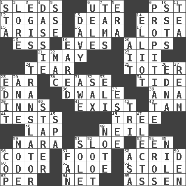ACROSS 1. Bobsleighs 6. Shoshoni 9. Pacific Standard Time (abbr.) 12. Ancient Roman robes 13. Letter starter 14. Celtic language 15. Ascend 16. _ mater 17. Globular water bottle used in Asia 18. Double-curved letter 19. Nights before holidays 20. High mountains 21. "If ____ say so..." 23. One more than two 24. Pull apart 25. Carrier 28. Ewer handle 30. Desist 34. Periodic rise and fall of the sea level 35. Heredity factor (abbr.) 36. A sleeping potion; an opiate (poet.) 38. Santa ___, CA 39. Lodging establishments 41. Be 43. Scottish cap 44. Trials 46. Woody plant 48. Pet locale 49. Famous astronaut Armstrong 50. Hindu Mythology: god of death 51. A type of plum 53. Car or cant ending 56. ____ d'Azur (French Riviera) 57. Pick up the tab 58. Sour-tasting 60. Aroma 61. Medicinal plant 62. Fur scarf 63. For each 64. Fish or hair follower 65. NE Netherlands city DOWN 1. R.R. building 2. Old wives' tales, e.g. 3. Armor plate that protects the chest 4. Hyrax 5. Compass dir. 6. Ubangi River tributary 7. Scottish caps 8. Period 9. Conciliate 10. Fast planes 11. Beverage made from leaves 13. American folk hero Crockett 14. American author Paul (1891-1958) 19. Having ears or earlike features 20. Small island 22. Apple computer (short form) 24. Interpreter 26. Pulitzer Prize-winning author Ferber 27. 480, 500 or 516 sheets of paper 28. Prepare for publication 29. Singer Murray 31. Deep reverence 32. Saxophone 33. Connecticut Ivy Leaguer 37. First name in cosmetics 40. A viewer who gazes fixedly 42. Three (prefix) 45. Health resort 47. Chooses 49. Short letter 50. Method 51. Flatfish 52. Plunder 54. Greek god of love 55. The longest river in the world 56. Police officer (slang) 57. Air blower 58. White ___ sheet 59. Lair