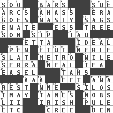 ACROSS 1. "Barney Miller" actor Jack 4. Drinking establishments 8. Take to court 11. Curves 13. Collect or gather 15. Period 16. Moves 17. Offensive 18. Settles 19. Maternal 21. Curvy letter 22. Family _ (genealogy) 23. Boy, to dad 24. Small drink 27. The 19th letter of the Greek alphabet 29. Singer James 30. Standard of perfection 34. Fenced enclosure 36. Needle holder 39. Haggard of country music 40. Narrow board 41. Paris' subway 43. The longest river in the world 44. Spanish missionary in California 46. Be tempered by heat 47. Beverage made from leaves 48. Artist's stand 49. Scottish caps 51. Auto club (abbr.) 53. Lizard (obsolete) 54. Santa ___, CA 57. Remainder 60. Compass dir. 63. Grain storage towers 65. "If ____ say so..." 66. Softens 69. Crowds into 70. Cards in a Roman deck? 71. From or relating to Ireland 72. Whimper 73. And so on (abbr.) 74. Algonquian 75. Lair DOWN 1. Gurus 2. U. of Maine site 3. Sea 4. Forbid 5. Nanny (var.) 6. Raze (variant) 7. Fast planes 8. Scorch 9. Goad 10. Relaxation 12. Fast jet (abbr.) 14. System (abbr.) 18. SAT takers 20. Eastern Standard Time (abbr.) 25. A whole individual unit 26. Eucharist need 28. Direct toward a target or goal 29. Plea 31. One of the Great Lakes 32. Silent film actress Nazimova 33. Area sheltered from the wind 34. Entreaty 35. Hearing organs 37. Shoshoni 38. Feeling or showing extreme anger 40. Compass dir. 42. Norwegian king 45. In the manner of 50. Mountains (abbr.) 52. Opposed to 54. Verbally 55. Having high moral qualities 56. NE Netherlands city 57. Cause heat under the collar 58. Give off 59. Ketch in the Levant 61. Drug cop 62. Independent ruler or chieftain 64. Mischievous child 67. Compass dir. 68. A female animal or person