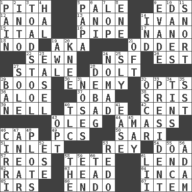 ACROSS 1. Heart or essence 5. Diluted with white 9. Begley and Asner 12. Small Philippine buffalo 13. At once, immediately (arch.) 14. _ the terrible 15. Slanted text style (abbr.) 16. Corncob 17. Billionth: prefix 18. Dreamland 19. Alias (abbr.) 21. More peculiar 22. Stitched 24. Overdraft (abbr.) 26. Eastern Standard Time (abbr.) 27. Showing deterioration from age 28. Dunce 29. Expressions of contempt or scorn 30. Foe 32. Elects 36. _ vera 37. Chief or king in Benin or Nigeria 38. Indian titles of respect 39. 1994 drama film starring Jodie Foster 40. Sadhe (variant) 42. Penny 43. Cassini of fashion 44. Collect or gather 46. Head covering 49. Personal Computers (abbr.) 50. Indian skirt 51. An arm off of a larger body of water 53. Marina Del _, California 54. ___ good deed 57. Vintage cars 58. Wig 61. Grant temporary use of 62. Pace 63. Froth on beer 64. South American Indian 65. Big collection agency 66. Inside; within (prefix) 67. Detail DOWN 1. Ache 2. To the inside or interior of 3. Inedible or poisonous agaric 4. Actor Linden 5. Dad 6. Black tropical American cuckoo 7. Chop off 8. Compass dir. 9. Dodge 10. Natives or inhabitants of Denmark 11. Derisive sound 14. Working for oneself (abbr.) 19. Leather borer 20. Leg joint 21. Often (poetically) 23. Artist's stand 24. Roamer 25. Roguish 27. Flatfish 28. Debunk (Brit. slang) 29. Bar 31. Olfactory organs 32. Motion picture award 33. Elected leader of a country 34. Airtight sealed metal containers 35. Fast jet (abbr.) 40. Affectionate concern, for short 41. Comfort 43. Elect 45. Can I? 46. High-altitude cloud 47. Approach 48. Ground plans 52. Compass dir. 53. Redecorate 55. At one time in the past 56. First of billions? 58. Definite Article 59. Car or cant ending 60. Bit 61. Cards in a Roman deck?