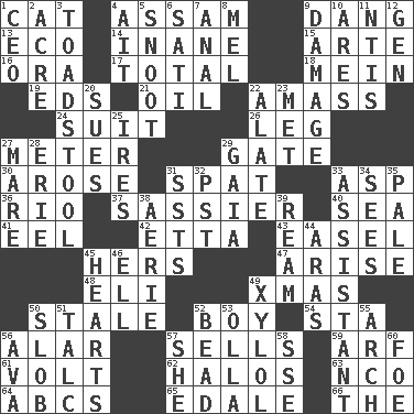 ACROSS 1. Domesticated feline 4. Indian state 9. Mild oath, euphamism for damn 13. Environmental prefix 14. Empty; void 15. Johnson of "Laugh-In" 16. Mouth or opening 17. "_____ Recall" 18. Count _ (2 wds.) 19. Begley and Asner 21. Lubricate 22. Collect or gather 24. Set or collection 26. Part of a journey 27. Distance measurement 29. Yard entry 30. Came up 31. Petty quarrel 33. Cleo's killer 36. _ de Janeiro 37. More disrespectful 40. Ocean 41. Snakelike fish 42. Singer James 43. Artist's stand 45. Possessive pronoun 47. Originate 48. Biblical high priest 49. Dec. holiday 50. Lacking originality or spontaneity 52. Male child 54. R.R. building 56. Having or resembling wings 57. Makes a sale 59. Sandy's bark 61. Electrical Unit 62. Auras 63. Non-commissioned officer (abbr.) 64. Lettered men learn these first 65. Peak District village in England 66. Definite Article DOWN 1. Corporate head (abbr.) 2. 1/640 square mile 3. Inedible or poisonous agaric 4. Small island 5. Snob 6. Suttee (variant) 7. Of or related to the anus 8. Cartoonist voice _ Blanc 9. Break 10. Ancient Greek god of war 11. Nuclear Threat Initiatives 12. Commissioned military rank (abbr.) 20. Institutes legal proceedings 22. Having winglike extensions 23. Was introduced to 25. Angers 27. Female horse 28. 4th largest of the Great Lakes 29. Greek goddess of the earth (variant) 31. Fast planes 32. Pacific Standard Time (abbr.) 33. Aide 34. Observes 35. Light colored 38. Nest on high 39. 480, 500 or 516 sheets of paper 44. Ancient river in northeast Turkey 45. Centers of feelings and intuitions 46. Pipe bend 49. Xylene (variant) 50. Messy guy 51. Baby powder 52. Necklace unit 53. Water jar 55. Bowlike part 56. Actress Gardner 57. A female animal or person 58. Compass dir. 60. Enemy
