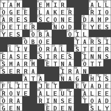 ACROSS 1. Scottish cap 4. Independent ruler or chieftain 8. 100% 11. Double curve, resembling the letter S 13. Member of a famous L.A. basketball team 15. _ de Janeiro 16. Ancient Greek god of war 17. Biscuitlike quick bread 18. Moist 19. Prevent from occurring 21. Dreamland 22. Sight organs 23. It is so 24. Chief or king in Benin or Nigeria 27. Lubricate 29. Mitch Miller's instrument 30. Tarsus (plural) 34. 54 in ancient Rome 36. Spoken 39. Guide 40. Comfort 41. Founders of families 43. Taverns 44. Excessive but superficial compliments 46. Inactive volcano in Sicily 47. Baseball player Mel 48. Father Junipero _ 49. SW Asia republic 51. _ moment's notice (2 wds.) 53. Tired old horse 54. Part of HMS, perhaps 57. Sudden quick movement 60. _ stream 63. Dodge 65. Be footloose 66. Native American of Southwest Alaska 69. Toward shelter 70. Mouth or opening 71. Remove soap 72. Frog relative 73. Commissioned mil. rank 74. Locale of original sin 75. Cunning DOWN 1. Sycophant 2. Match 3. Confronts 4. Raised railways 5. Apple computer (short form) 6. Picture 7. Western Nevada city 8. Like ___ of sunshine 9. Welles in "The Third Man" 10. Chops off 12. Compass dir. 14. Do over again 18. Conveyance 20. Director Reiner 25. Scornful sounds 26. Nest on high 28. ___ a Wonderful Life 29. Make much ado about nothing 31. Monthly bill 32. Posted 33. Big collection agency 34. Unable to walk 35. Austrian river, tributary to the Danube 37. Tate display 38. Soviet premier 1918-24 40. Curvy letter 42. "Two Mules for Sister ____" 45. Floor protector 50. Mature 52. Partly open 54. Rings 55. Standard of perfection 56. Full of seeds 57. Tree-dwelling hopper 58. Old wives' tales, e.g. 59. "Terrible" tsar 61. Writer Wiesel 62. Watch over 64. Large container 67. Purpose 68. "___ Little Indians"