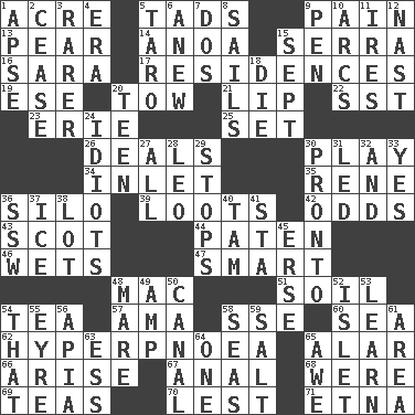 ACROSS 1. Land measure 5. Small amounts or degrees 9. Ache 13. Lightbulb-shaped fruit 14. Small Philippine buffalo 15. Father Junipero _ 16. "Two Mules for Sister ____" 17. Homes 19. Compass dir. 20. Pull behind 21. Mouth edge 22. Fast jet (abbr.) 23. One of the Great Lakes 25. Arrange properly for use 26. Allots cards 30. Live dramatic performance 34. An arm off of a larger body of water 35. French philosopher Descartes 36. Grain storage tower 39. Plunders 42. Probability 43. Highlander 44. Eucharist need 46. Soaks 47. Don Adams' spy role 48. Big _ 51. The visible part of the earth's surface 54. Afternoon social gathering 57. Nanny (var.) 58. Compass dir. 60. Ocean 62. Abnormally rapid or deep breathing 65. Having or resembling wings 66. Originate 67. Of or related to the anus 68. We are 69. Afternoon social gatherings 70. For fear that 71. Inactive volcano in Sicily DOWN 1. Domed church section 2. Desist 3. Less widely known 4. Period 5. Pacific island yam 6. Afresh 7. Two (Sp.) 8. Moves on water 9. Writing instrument 10. Curves 11. Angers 12. Political cartoonist Thomas 15. Back-to-school mo. 18. Expire 20. Adolescent 24. Foolish or stupid persons 27. Everything 28. Lion 29. Constricts 30. Right away 31. Directed 32. Also 33. Affirmative reply 36. Compass dir. 37. Frozen water 38. Car dealer's back yard 40. Scottish cap 41. R.R. building 45. Celtic language 48. Female horse 49. Electrical Unit 50. Lessep's creation 52. Small island 53. Memorize 54. Not this but _ 55. Jane of fiction 56. Capital of Western Samoa 58. Oceans 59. Table seasoning 61. Length times width 63. Double-curved letter 64. Single 65. Deep reverence