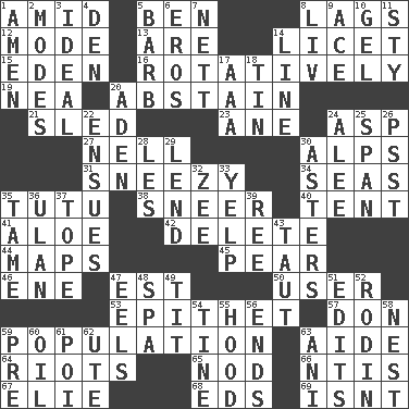 ACROSS 1. Among 5. Benjamin's nick name 8. Straggles 12. Method 13. "We ___ not amused" (Victoria) 14. It is permitted: Lat. 15. Genesis locale 16. Rotating or pertaining to rotation 19. Teachers' org. 20. Refrain by choice 21. Downhill vehicle 23. One (Scot) 24. Viper 27. 1994 drama film starring Jodie Foster 30. High mountains 31. Dwarf with a sinus problem 34. Oceans 35. Ballerina skirt 38. Contemptuous expression 40. Portable shelter 41. _ vera 42. Erase 44. Atlas contents 45. Lightbulb-shaped fruit 46. Compass dir. 47. Eastern Standard Time (abbr.) 50. One who uses or employs something 53. Curse 57. Spanish title 59. Census information 63. Assistant 64. Debaucheries 65. Dreamland 66. Nuclear Threat Initiatives 67. Writer Wiesel 68. Begley and Asner 69. Is not DOWN 1. So be it 2. Methods 3. Standard of perfection 4. Lair 5. Sharp remark 6. Greek god of love 7. Remaining after all deductions 8. 54 in ancient Rome 9. Adept person 10. Set 11. Filthy place 14. Actor's bit 17. Auto club (abbr.) 18. Shallow baking pan 20. An important port of Yemen 22. Follows as a consequence or result 24. Toward shelter 25. Connect, as a bridge 26. Inconspicuous attention getter 28. French article 29. Grant temporary use of 30. Michaelmas daisies 32. Last letter of the English alphabet 33. Sharp bark 35. Not wild 36. Uhlan (variant) 37. Drink excessively 39. To sift 43. Tense 47. Snakelike fish 48. Health resort 49. Teat (slang) 51. Prepares for publication 52. "The Thinker" sculptor 54. Prong on a fork 55. Parka part 56. Extremities 58. A home for chicks 59. Before (prefix) 60. Petroleum 61. Luau course 62. Shoshoni 63. Black tropical American cuckoo