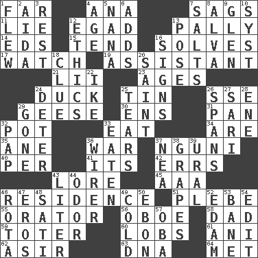 ACROSS 1. Distant 4. Santa ___, CA 7. Droops 11. Falsehood 12. Mild oath 13. Friendly 14. Begley and Asner 15. Watch over 16. Finds the solution 17. Observe 19. Aide 21. Cards in a Roman deck? 23. Eras 24. Evade 25. Shallow baking pan 26. Compass dir. 29. Honkers 30. Followers of ems 31. Baking dish 32. Cooking vessel 33. Consume 34. "We ___ not amused" (Victoria) 35. One (Scot) 36. Armed conflict 37. Group of southern Bantu languages 40. For each 41. It is 42. Blunders 43. Old wives' tales, e.g. 45. American Automobile Association (abbr.) 46. Dwelling 51. Military trainee 55. Speaker 56. Mitch Miller's instrument 58. Male parent 59. Carrier 60. Tennis shots 61. Cuckoo 62. SW Saudi Arabia district 63. Heredity factor (abbr.) 64. Was introduced to DOWN 1. Soared 2. Opera by Verdi 3. Respite 4. Mature 5. Grandmother 6. Sums up 7. Table seasonings 8. Inventor's middle name 9. Small, secluded valley 10. System (abbr.) 12. Principles of right and wrong 13. Introduce or present, as a question 16. Signals 18. A slight indication 20. Inhabitant of Heaven 22. Eisenhower's nickname 24. Prevent from occurring 25. Lacerates 26. Connects, as a bridge 27. Indian skirt 28. Compass dir. 29. Went 32. Infant food 33. Ingested 36. One who wires 37. Teachers' org. 38. Raisin fruits 39. Mountain range 43. 61 cubic inches 44. Scent 46. Roll call or roster of names 47. Greek god of love 48. Suttee (variant) 49. Lacking warmth 50. Inky black, to poets 52. Dutch treat 53. Object of repulsion 54. Prepare for publication 57. Chief or king in Benin or Nigeria