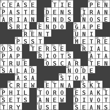 ACROSS 1. Stop 6. Standoff 9. Fenced enclosure 12. Thick mixture 13. Lairs 14. SW Asia republic 15. Believer in; advocate of (suffix) 16. Extremities 17. Sense of smell 18. Indian title of respect (Mr.) 19. Inside; within (prefix) 20. Open wide 21. Monthly bill 23. Single; one (prefix) 24. Inconspicuous attention getter 25. Distance measurement (Brit.) 28. Bear (Spanish) 30. Laconic 34. Monetary unit of Yemen 35. Infant food 36. Disturbances 38. "One Day ___ Time" 39. Loyal 41. Witty Wilde 43. "___ Little Indians" 44. First course 46. Connecting point 48. White ___ sheet 49. Portico 50. Group working together 51. Inactive volcano in Sicily 53. What Jean-Claude Killy likes to do 56. Silvers or Donahue 57. "Corrida" creature 58. 1973 Nobel Price Winner (Physics) Leo 60. Puts into a specified state 61. Afresh 62. A piece of turf (Scot.) 63. Attempt 64. Purpose 65. Seines DOWN 1. Numbers guy (abbr.) 2. Hearing organs 3. SW Saudi Arabia district 4. Flight of steps 5. Car or cant ending 6. Look after 7. _ china 8. Curvy letter 9. Conciliate 10. Relaxation 11. Compass dir. 13. Scratch 14. More empty; more void 19. Keyboard key 20. Chewing product 22. Eastern Standard Time (abbr.) 24. Teen's desire 26. Pace 27. Liveliness 28. Elects 29. "Two Mules for Sister ____" 31. _ de Janeiro 32. Distress signal 33. And so on (abbr.) 37. Before Barbara or Clara 40. Artist's stands 42. Friend of Pooh 45. Obsolete 47. Hyrax 49. Overwhelm 50. "Mermaids" star 51. Immeasurably long periods of time 52. Relationship diagram 54. Polynesian shrub of the pepper family 55. Image 56. Pacific Standard Time (abbr.) 57. The 19th letter of the Greek alphabet 58. Begley and Asner 59. It is