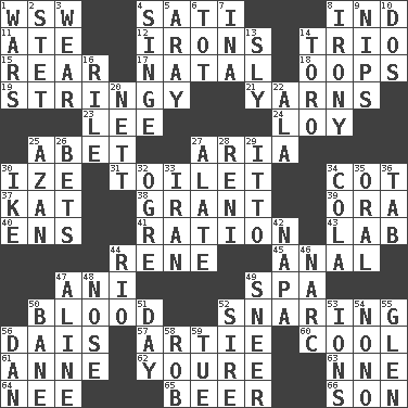 ACROSS 1. Compass dir. 4. Suttee (variant) 8. Indiana (abbr.) 11. Had dinner 12. Metal shackles 14. Musical group of three 15. Bring up, as a child 17. Relating to or accompanying birth 18. I made a mistake 19. Slender, wiry 21. Tall tales 23. Area sheltered from the wind 24. Myrna of the movies 25. Collude with 27. Roberta Peters solo 30. Ending with capital 31. Bathroom plumbing fixture 34. Small bed 37. Krazy ___ of comics 38. Let have 39. Mouth or opening 40. Followers of ems 41. Food allowance for one day 43. Experiment locale 44. French philosopher Descartes 45. Of or related to the anus 47. Black tropical American cuckoo 49. Health resort 50. Vital fluid 52. Catching in a trap 56. Raised platform 57. Nick name for Arthur 60. Calm and collected 61. Singer Murray 62. You are 63. Compass dir. 64. Born 65. Fermented drink made from hops 66. Male child DOWN 1. Armed conflicts 2. Proofreading order 3. Put on (as clothing) 4. Scorch 5. Like ___ of sunshine 6. Small child 7. _ tizzy (2 wds.) 8. Literary sarcasm 9. Cuts off 10. Two (Sp.) 13. Mischievous 14. "Corrida" creature 16. Cause heat under the collar 20. Remaining after all deductions 22. According to 25. Muslim summons to prayer 26. Stakes 27. Having winglike extensions 28. Painter Guido (1575-1642) 29. "Tell ____ the Marines!" 30. D.D.E's nickname 32. Legendary monster 33. SW Asia republic 34. Root beer relative 35. Taken by mouth 36. Bar bill 42. California wine valley 44. River (Sp.) 46. Drug cop 47. Place in a line 48. Olfactory organ 49. Scornful expression 50. Object of repulsion 51. 24 hours 52. Title for a man of rank and authority 53. Charged particles 54. Words to Nanette 55. Small, secluded valley 56. Daniel's nick name 58. Director Reiner 59. Third day of the wk.