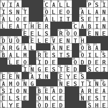 ACROSS 1. By way of 4. Give a ring to 8. 23rd letter of the Greek alphabet 11. Is not 13. Butter sub 14. Actor Alda or Thicke 15. _ vera 16. Came down and settled, as after flight 17. Bristle 18. Cordwainer's material 21. Small house or cottage 22. Snakelike fish 23. Friend of Pooh 25. Compass dir. 26. Superhero pair 29. Veterans Day date 32. Therefore, facetiously 34. A saturated hydrocarbon 35. Chief or king in Benin or Nigeria 38. Lip ointment 39. Musical pauses 41. Lubricates 43. Lion 44. Binary compound 45. More peculiar 46. Swallowed 50. _-fi 51. Car or cant ending 54. The 18th letter of the Arabic alphabet 55. Sight organs 57. Amid 59. Inhabiting a nest 63. The Jewish people; Israel 64. Necklace unit 67. Type of rug 68. Otherwise 69. At one time in the past 70. Egg locale 71. Sodium hydroxide 72. Wrote a lyric poem 73. A female animal or person DOWN 1. Small bottle 2. Capri or Wright 3. Small Philippine buffalo 4. Rough 5. 100% 6. Flowery wreath 7. Car dealer's back yard 8. Cadet 9. Smooth fabric 10. Silly 12. False hair 14. White ___ sheet 19. The bottom of a shoe or boot 20. Pipe bend 21. Small bed 23. Monthly bill 24. Washington bills 26. Apply (a substance) by light strokes 27. Mountain range 28. Stare 30. Flower holders 31. Parka part 33. Mine, in Marseilles 36. Auction offers 37. Actor Baldwin 39. Swiss mountan, "Queen of the Mountains" 40. Locale of original sin 42. _ Lanka 45. Lyric poems 47. Tired old horse 48. Watched over 49. Sight organ 51. Artist's stand 52. Poet Dickinson 53. Trap for birds or small mammals 56. Comedian Laurel of Laurel & Hardy 58. Compass dir. 60. Angers 61. Soft 62. Yard entry 64. Surprise greeting 65. Conclude 66. Adept person