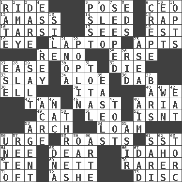 ACROSS 1. Travel on an animal 5. Introduce or present, as a question 9. Corporate head (abbr.) 12. Collect or gather 14. Downhill vehicle 15. Strike 16. Tarsus (plural) 17. Perceives with the eye 18. Eastern Standard Time (abbr.) 19. Sight organ 20. Portable computer 23. Flats, for short 24. Western Nevada city 25. Celtic language 27. Comfort 30. Choose 32. Expire 33. Kill 34. Medicinal plant 36. Small moist lump or mass 38. Pipe bend 39. Call ___ day 40. Deep reverence 43. Scottish cap 46. Political cartoonist Thomas 48. Roberta Peters solo 49. Feline 51. Lion 52. Is not 53. Bowlike part 54. Rich soil 56. Goad 58. Exposes to great heat 61. Fast jet (abbr.) 64. Born 65. Letter starter 66. Potato state 68. "___ Little Indians" 69. Remaining after all deductions 70. Less widely known 71. Often (poetically) 72. American tennis player Robert 73. Plate DOWN 1. Pace 2. "If ____ say so..." 3. Have the gumption 4. Double-curved letter 5. Inconspicuous attention getter 6. Butter sub 7. Oozed 8. Begley and Asner 9. Streamer paper 10. 90 degrees 11. Elects 13. Filth; sediment 21. Small Philippine buffalo 22. Cotton for raincoats, e.g. 23. Toward the sea 24. Marina Del _, California 26. To free from 27. Compass dir. 28. 100% 29. Table seasoning 31. "_____ Recall" 35. Artist's stands 37. Oblong pieces of solid material 41. Acquire through effort 42. Erode 44. Measure of real estate 45. Big _ 47. A blast of a horn 48. Direct toward a target or goal 50. Triplets 53. Rep 55. SW Saudi Arabia district 56. To (old English) 57. Coral collection 59. Pledge 60. Johnson of "Laugh-In" 61. Indian skirt 62. "______ My Girl" (Turtles hit) 63. Torque (variant) 65. Heredity factor (abbr.) 67. Male parent